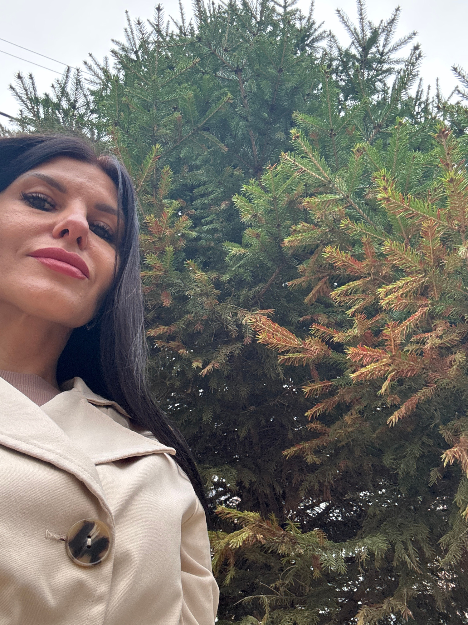 A low-angle shot features a woman with long dark hair wearing a tan trench coat with a visible button. The background is dominated by a dense evergreen tree with both green and reddish-brown needles.…read more