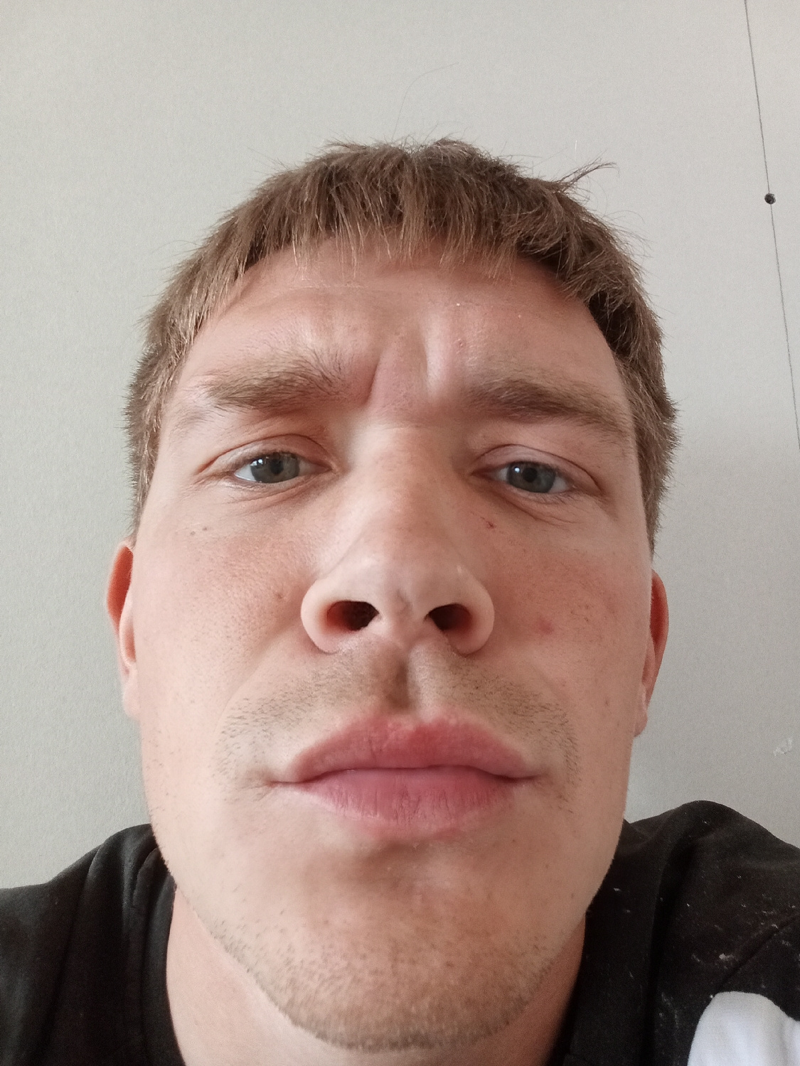 A close-up, low-angle selfie captures the face of a man, likely taken indoors in Chaikovsky, Russia. The man has short, light brown hair styled with a fringe, and distinctive blue eyes. His eyebrows a…read more