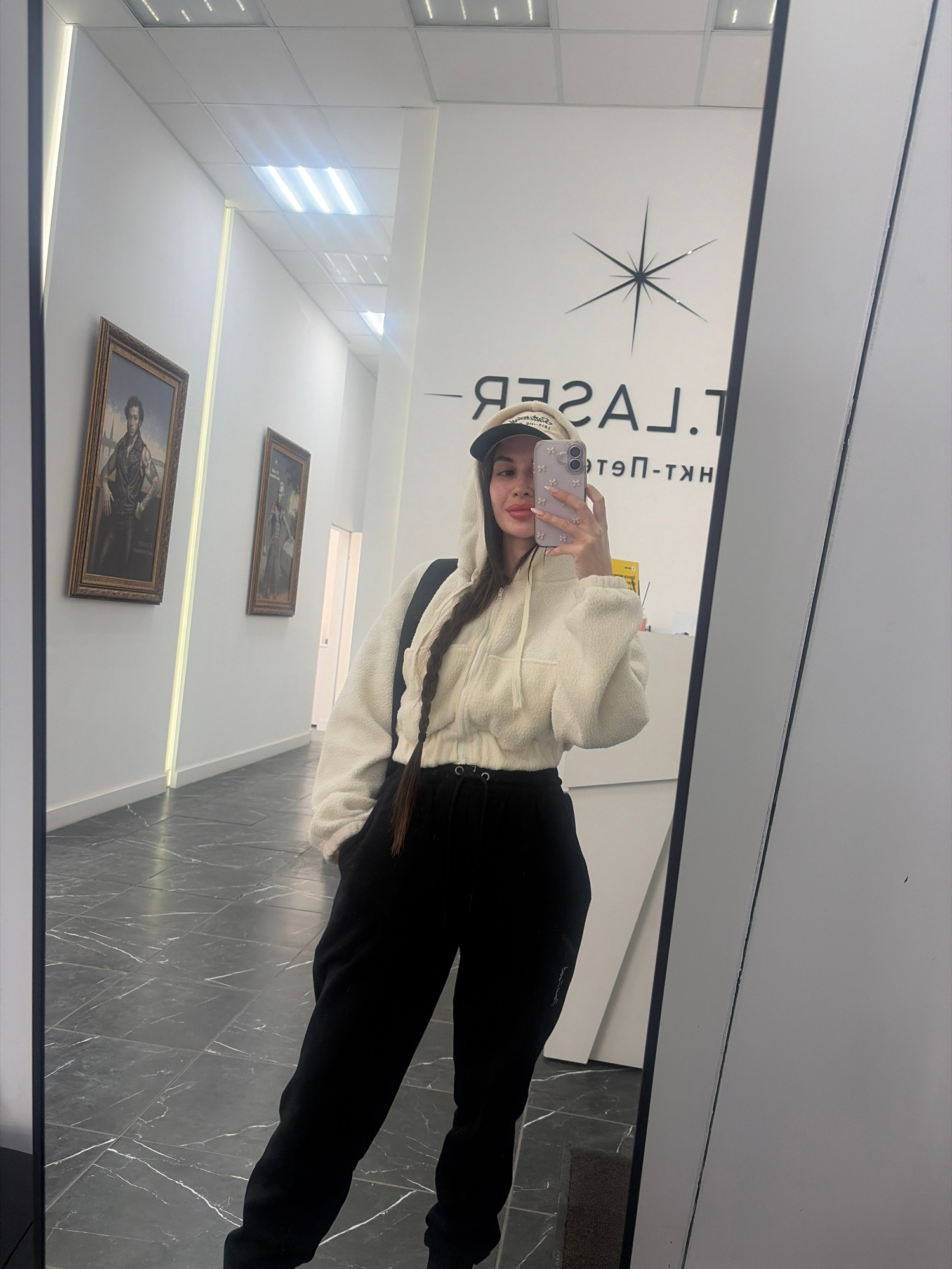The image displays a mirror selfie of a young woman taken indoors, rotated 90 degrees clockwise. The woman is reflected in a large, full-length mirror, capturing her from mid-thigh up. She has long, d…read more