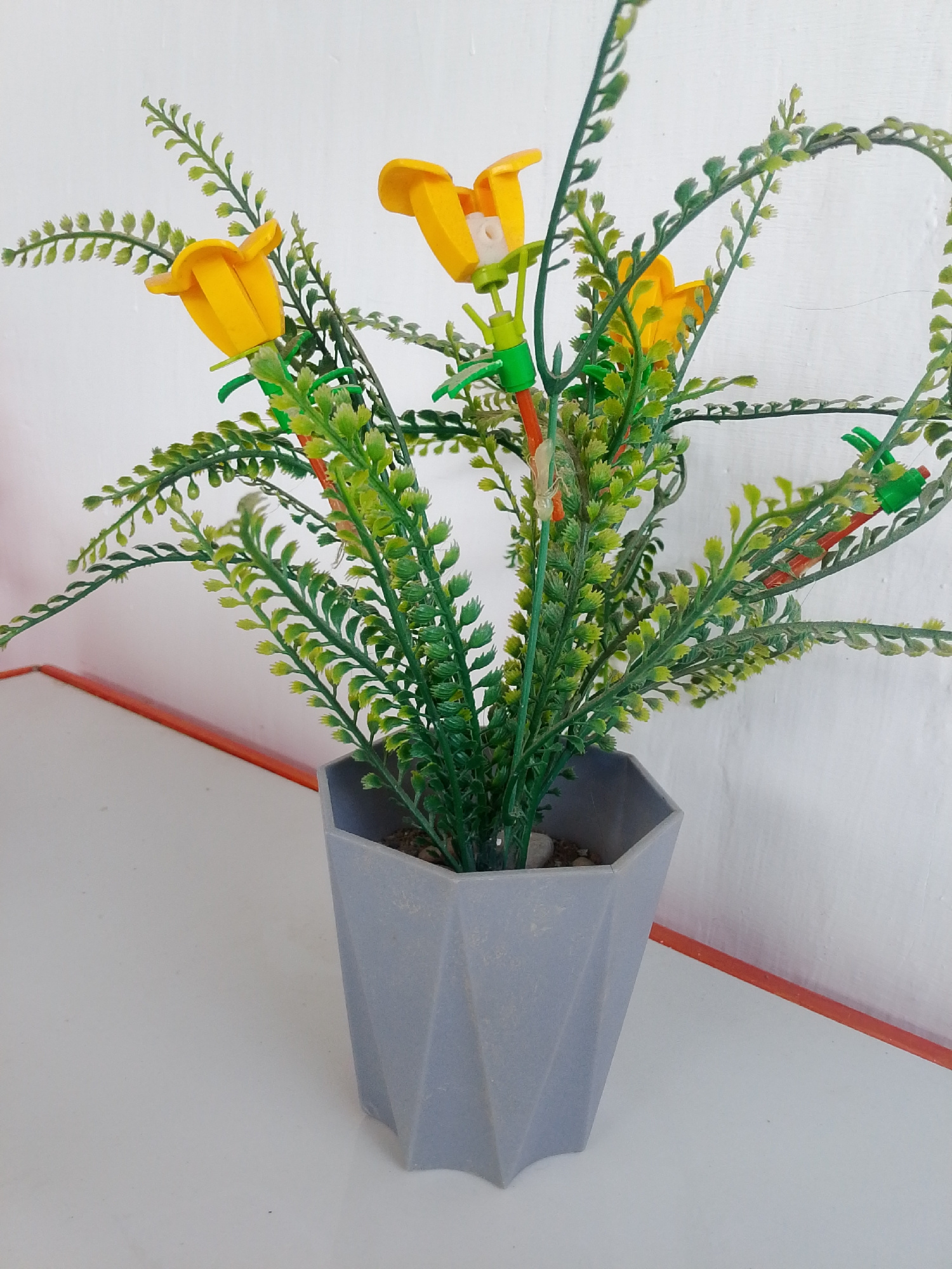 A medium, eye-level shot depicts a potted plant with artificial yellow flowers and green foliage. The plant sits on a white surface, likely a table or shelf, next to a white wall with a faint orange t…read more