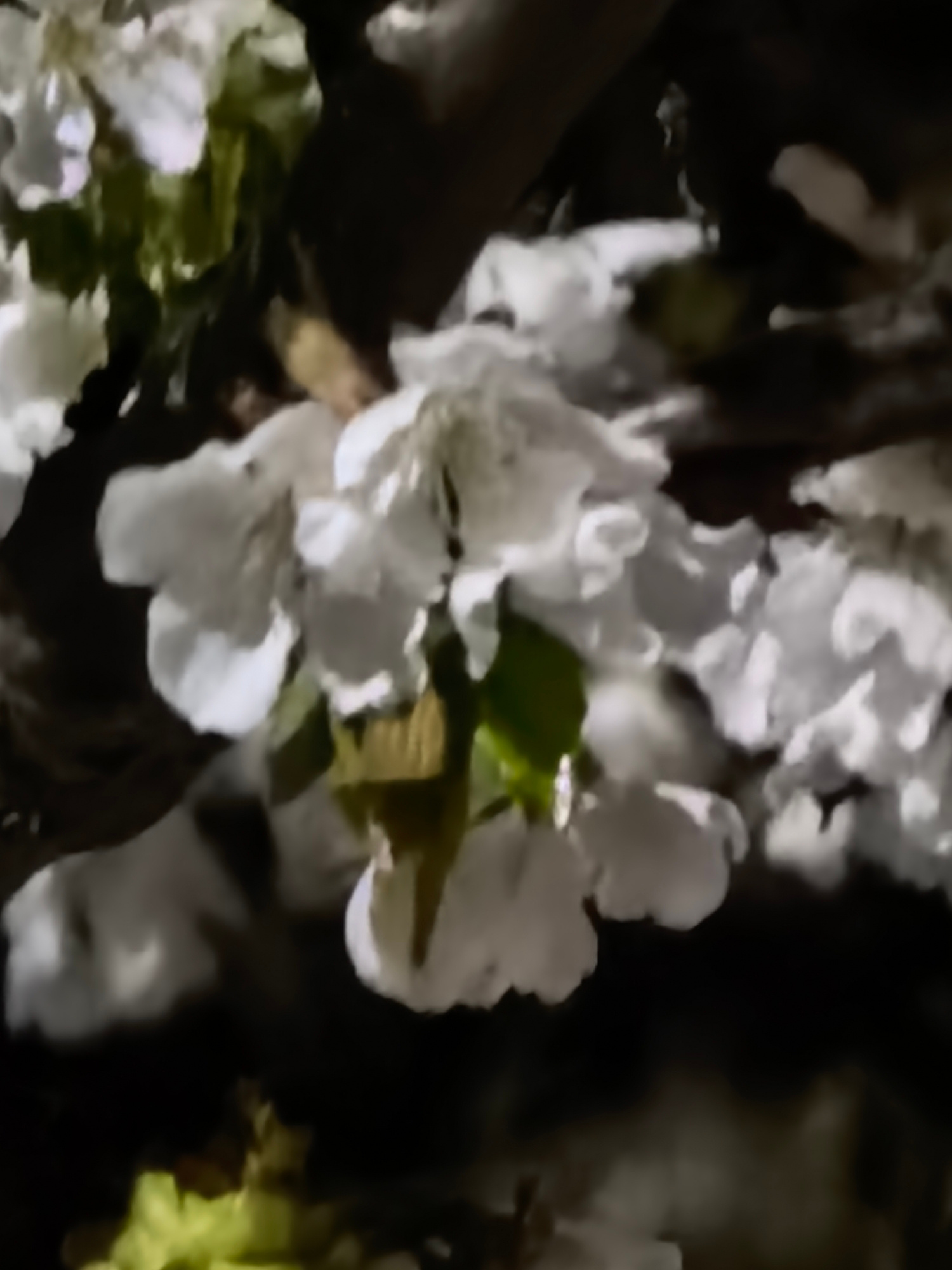 The image shows a cluster of white flowers with some green leaves, likely on a tree branch. The background is dark and blurry. The location and details are not discernable in the image.