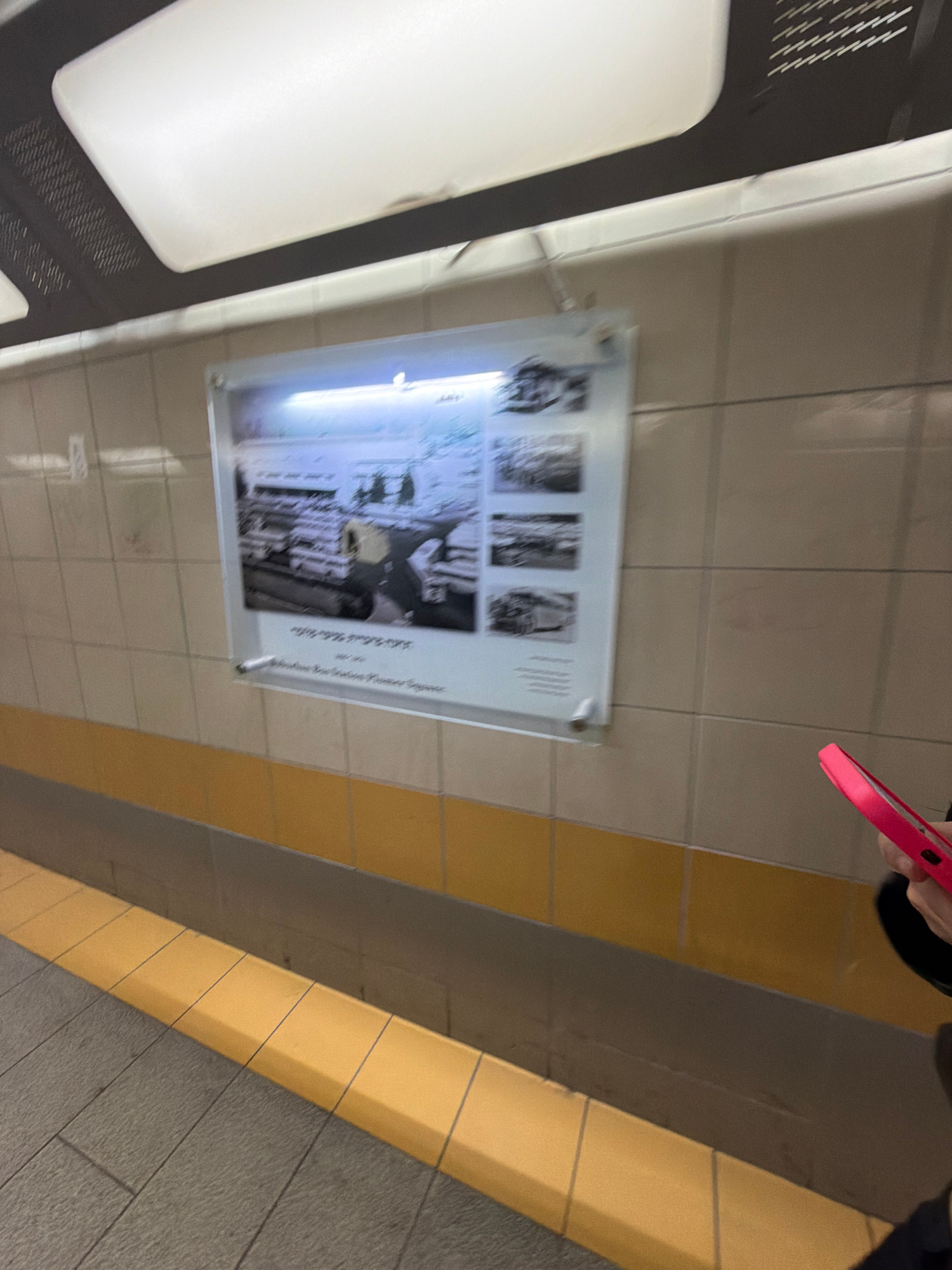 The image depicts a section of a tiled wall at what appears to be an underground location, likely a subway or pedestrian tunnel. The wall is made of light-colored rectangular tiles. Affixed to the wal…read more