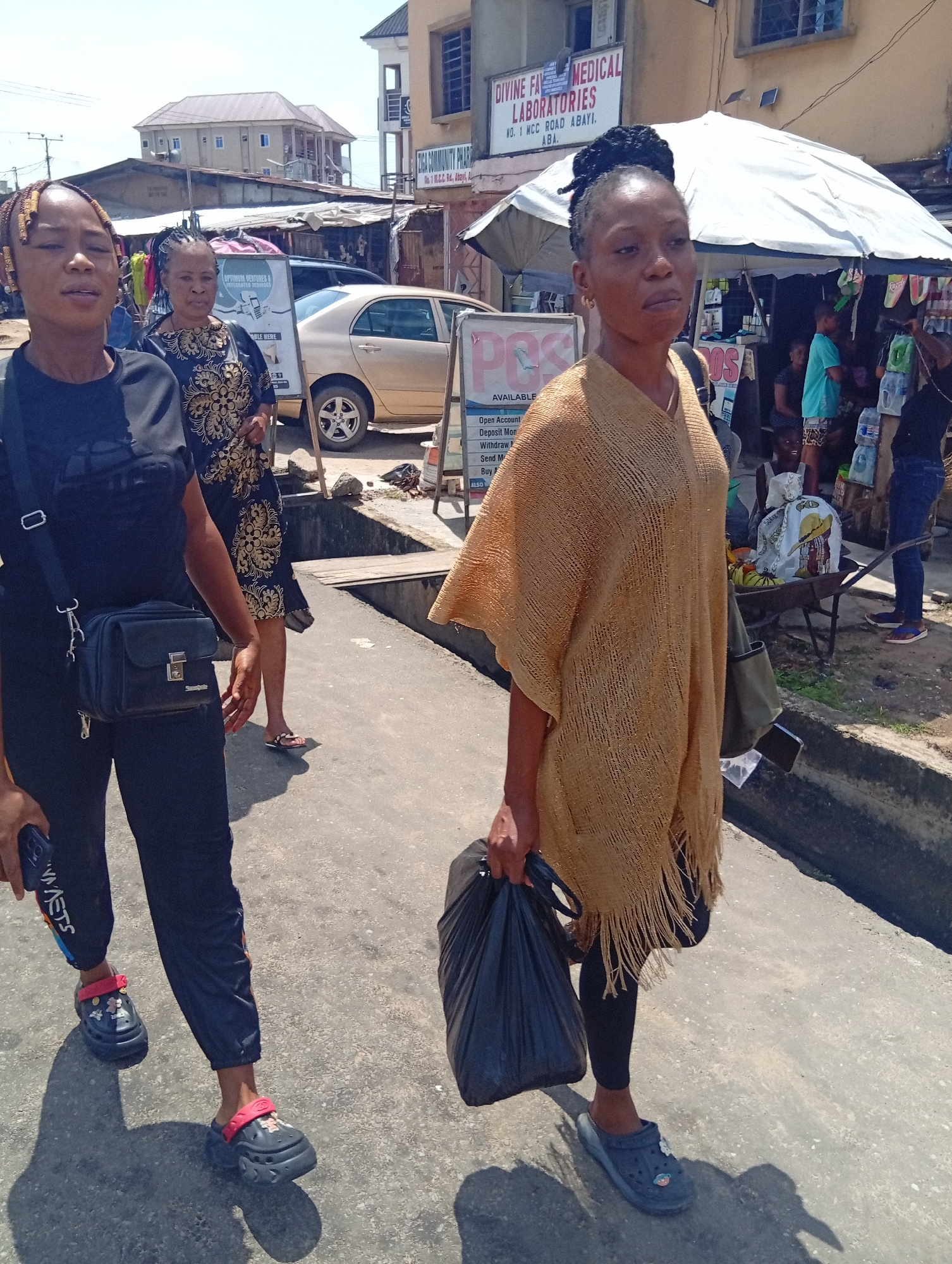The image captures a street scene in Aba, Nigeria. Three women are the primary subjects: one woman wears a black t-shirt, track pants, and decorated clog-style shoes, carrying a small purse. Another w…read more