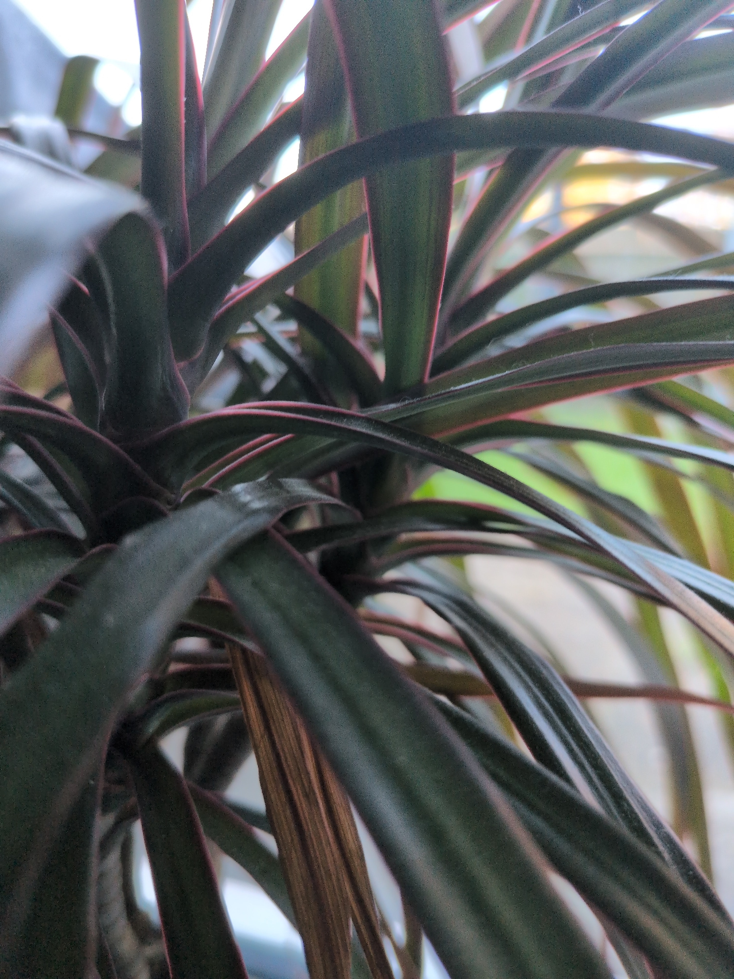 The image shows a close-up of a plant with long, narrow, dark green leaves that have a red or pinkish edge. Some leaves appear brown and dry. The plant is in a pot, which is visible at the bottom of t…read more