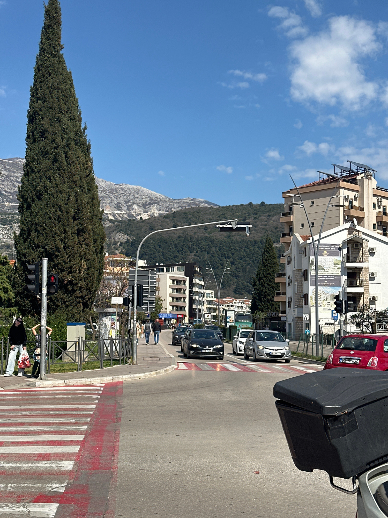 The image shows a street scene in Budva, Montenegro. The foreground features a crosswalk with red and white stripes, and pedestrians waiting to cross. Beyond the crosswalk, a street stretches into the…read more