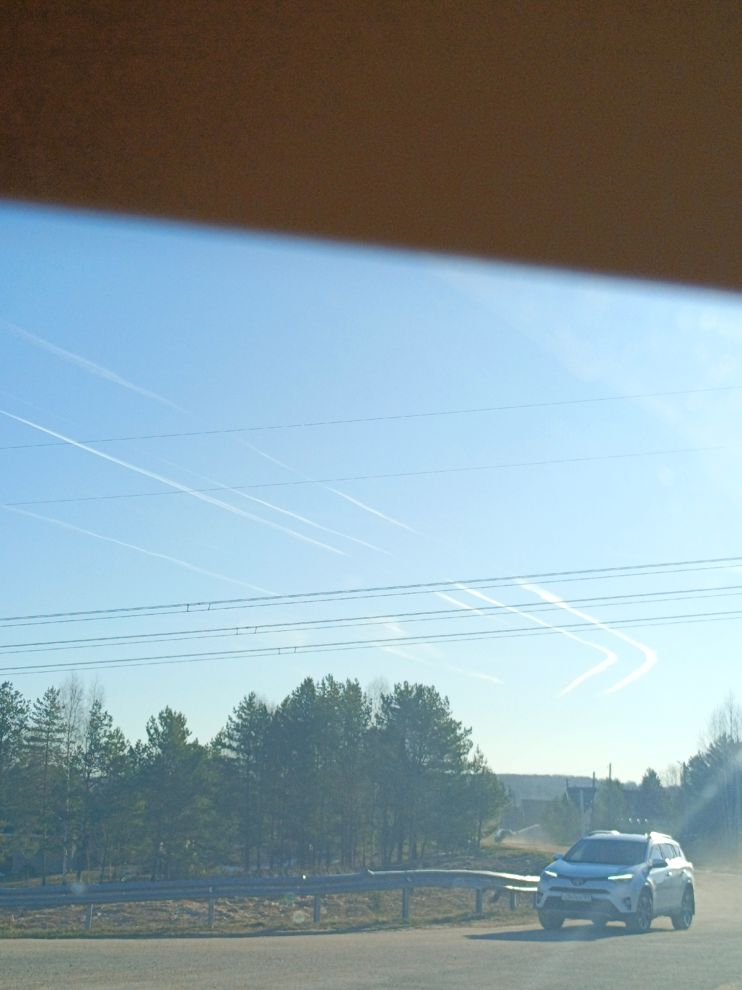 The image shows a white SUV on a paved road, with trees in the background and a blue sky with contrails. Power lines are visible in the sky. Based on visual analysis, the location is likely Dubovaya,…read more