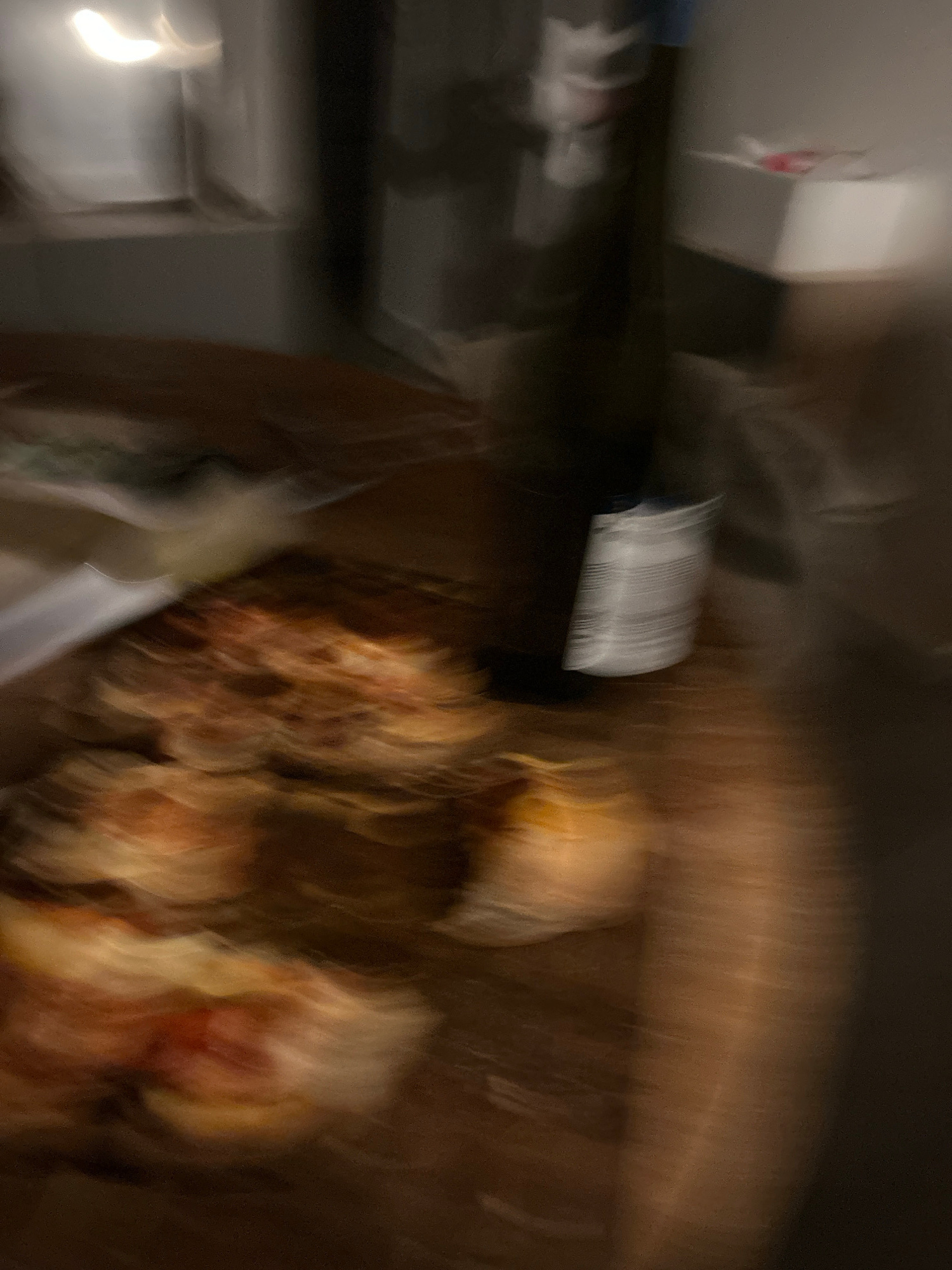 The image is heavily blurred, depicting an indoor scene captured in low light with significant motion. **Subjects:** The primary subjects are several irregularly shaped, light golden-brown objects, l…read more