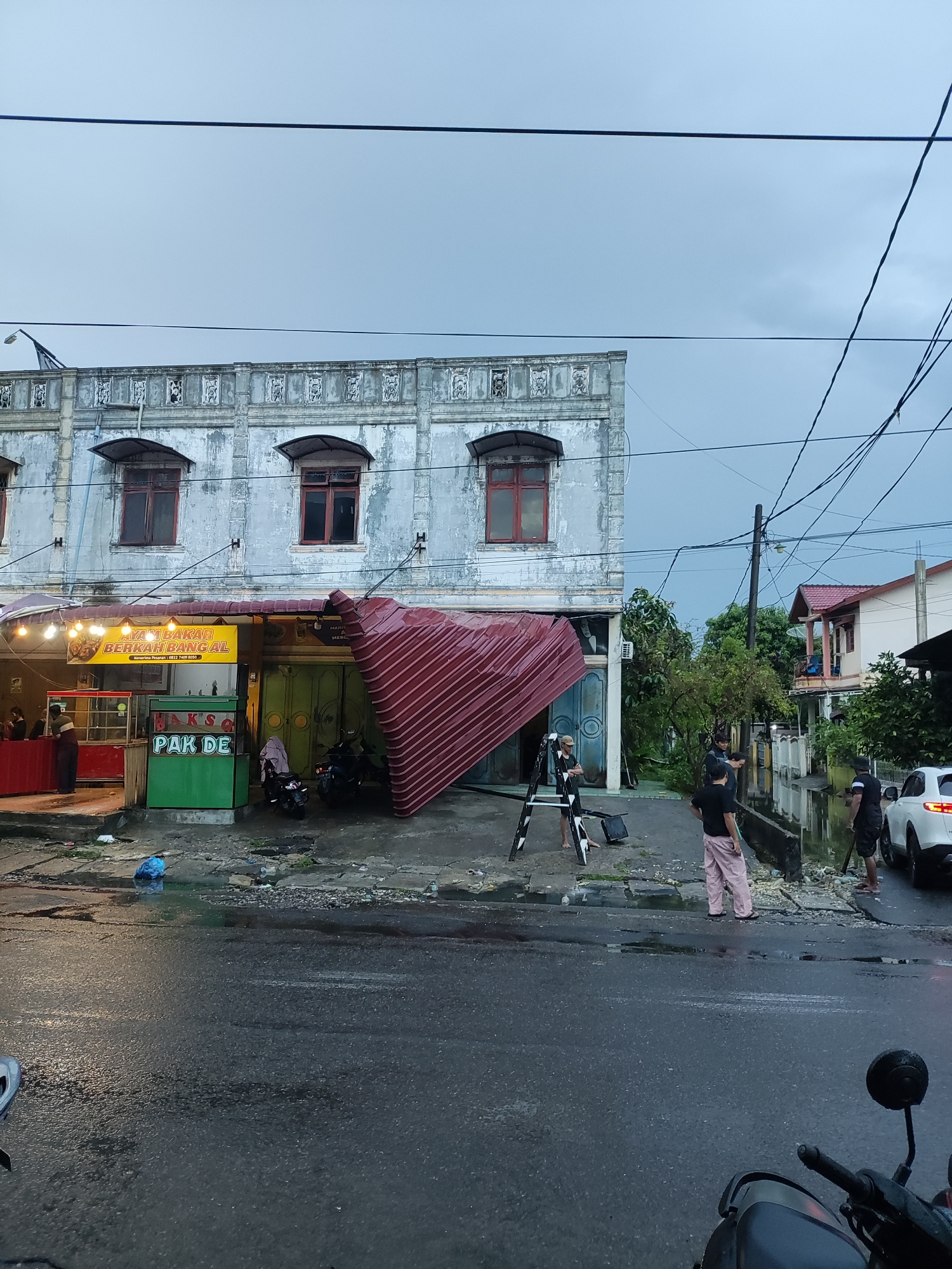 The image shows a street scene in Lhokseumawe, Indonesia. A building with weathered grey facade and a row of arched windows is visible on the left. The awning of a business attached to the building ha…read more