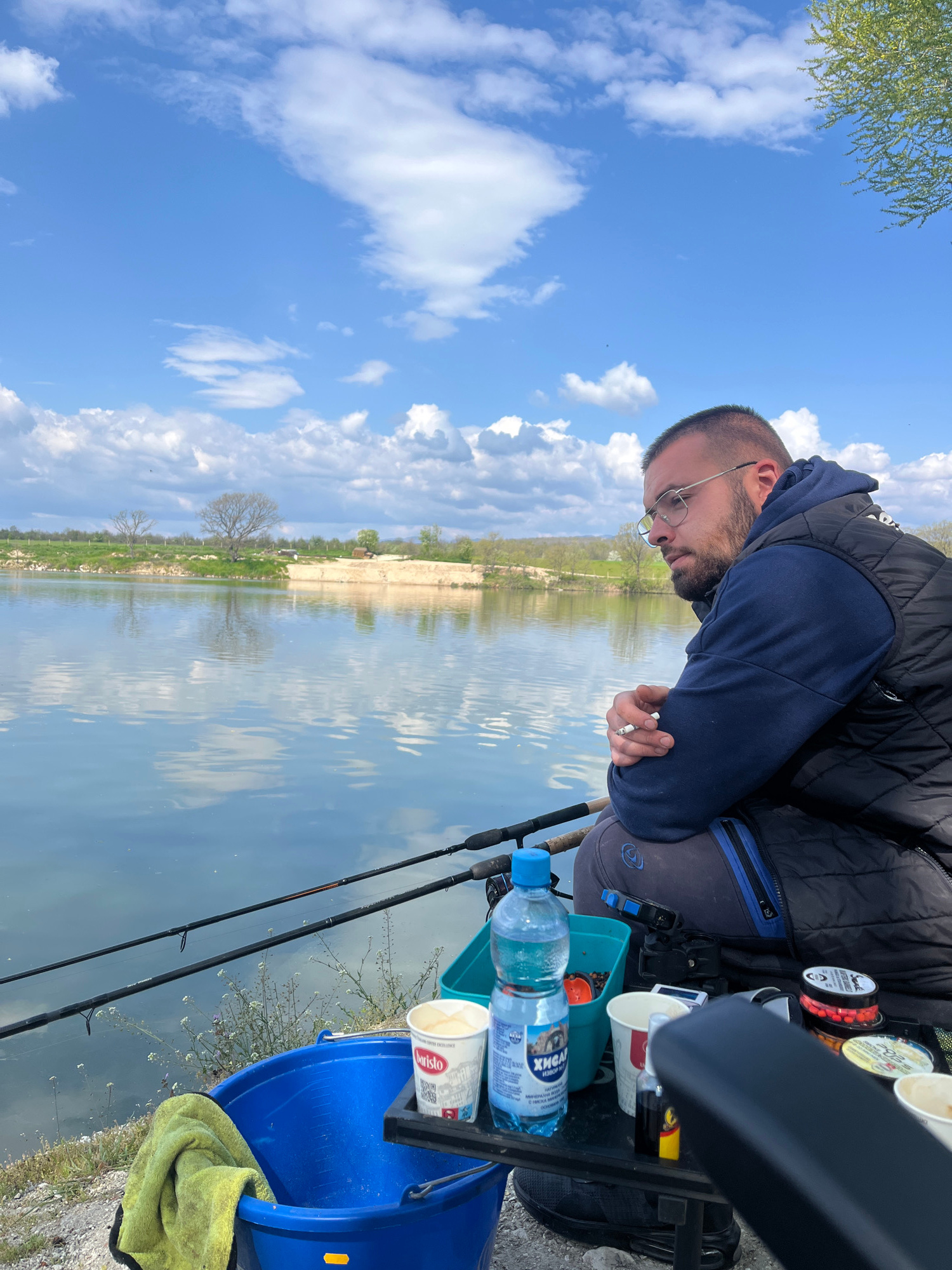 A man wearing glasses, a blue hooded sweatshirt, and a black vest is seen sitting near a body of water, possibly fishing. He holds what appears to be a cigarette in his right hand. To his right is an…read more