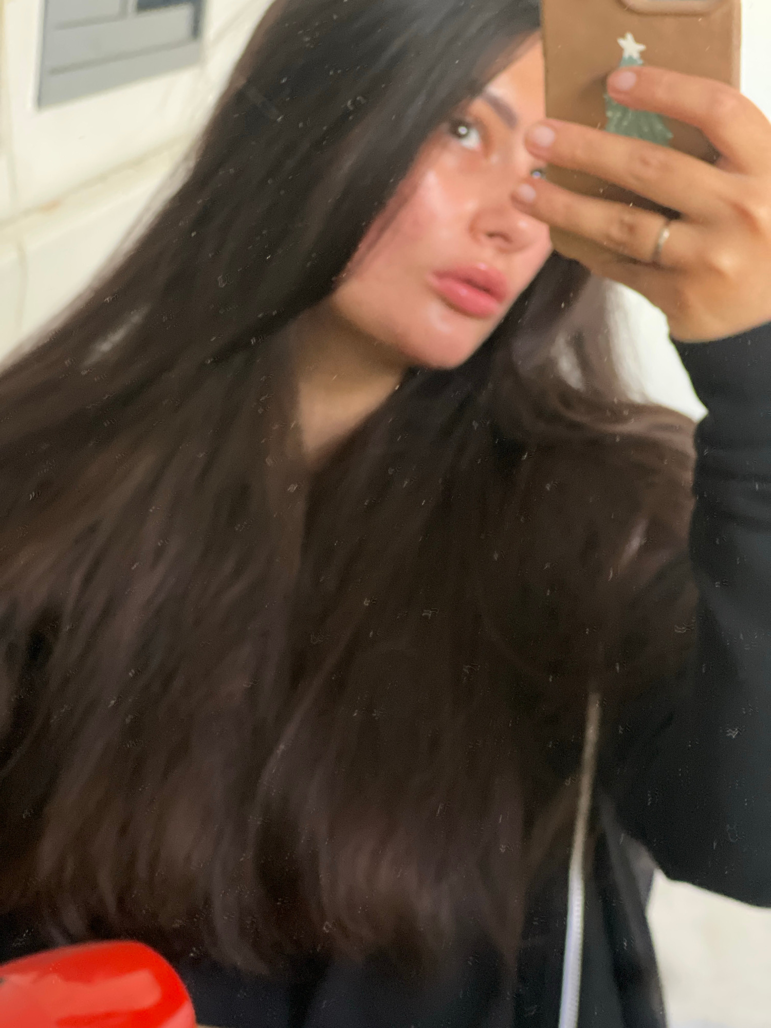 The image shows a person taking a selfie in a mirror. The person has long, dark brown hair and is wearing a dark-colored top. They are holding a phone with a light brown case. A silver ring is visible…read more