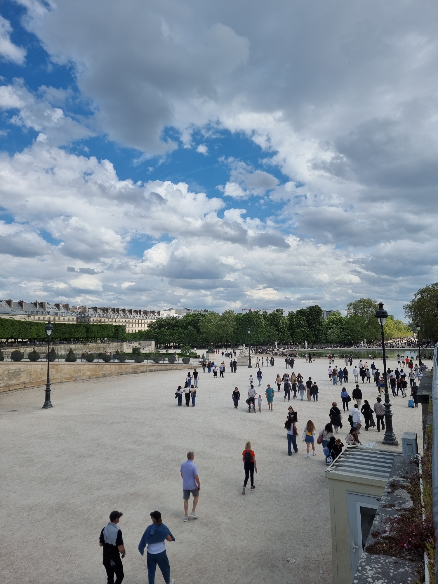 The image captures a scene in Paris, France. The perspective is from an elevated position, likely overlooking the Tuileries Garden. The scene shows a wide pedestrian walkway populated with numerous pe…read more