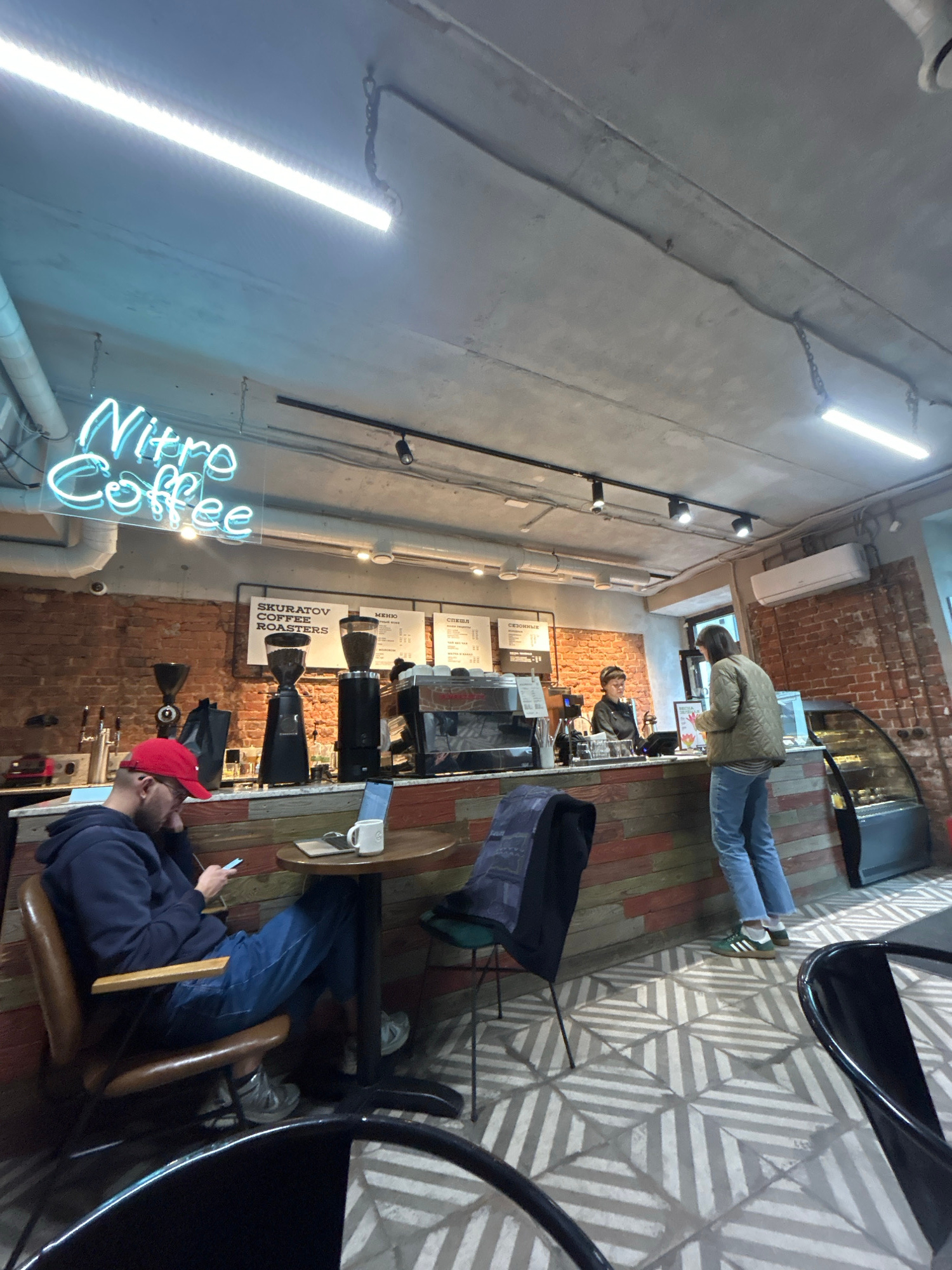 Here is a forensic description of the image. **Location:** The image appears to be taken inside a coffee shop called "Nitro Coffee." **Environment:** The interior of the coffee shop has a mix of exp…read more