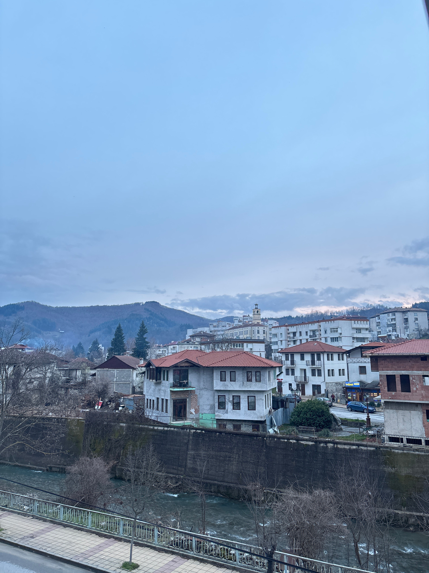 The image is a vertically oriented, slightly tilted view of Zlatograd, Bulgaria, taken from an elevated position, possibly a balcony. The scene is dominated by an overcast sky covering the left half o…read more