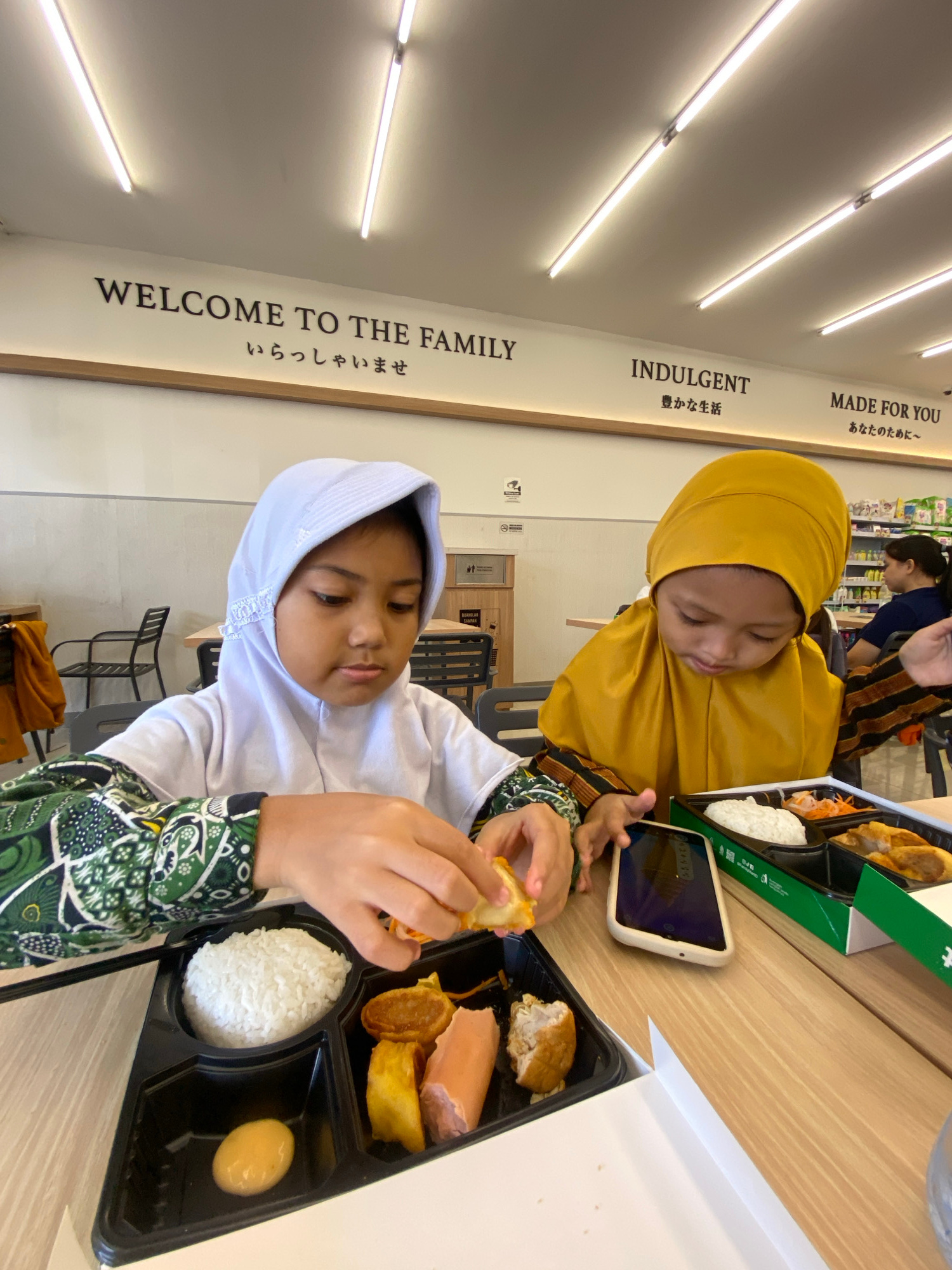 Two young girls are seated at a table in an indoor setting, possibly a restaurant or cafe in Sidoarjo, Indonesia. The girl closest to the viewer wears a white hijab and a green patterned sleeve, holdi…read more