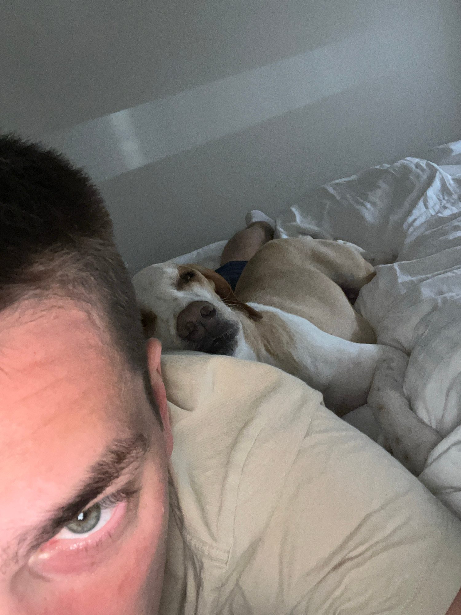 A man is lying in bed next to a dog. The man's face, including his eye and eyebrow, is in the foreground. The dog is curled up in the bed next to him, with its nose visible. The bed has white sheets a…read more