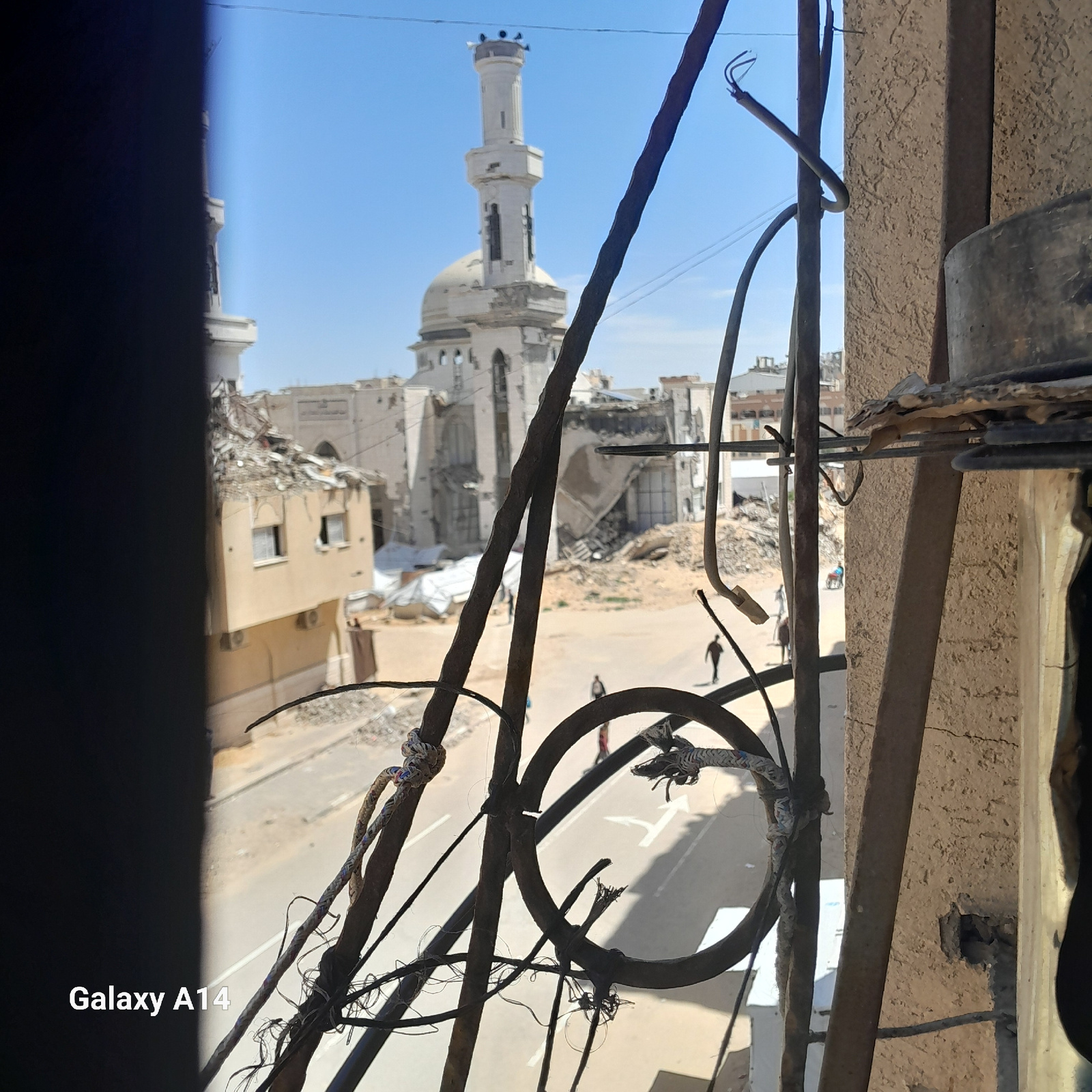 This image depicts a scene of widespread urban destruction in Khan Yunis, Palestinian Territory, observed from an elevated perspective. The foreground features dark framing on the left and a light bro…read more