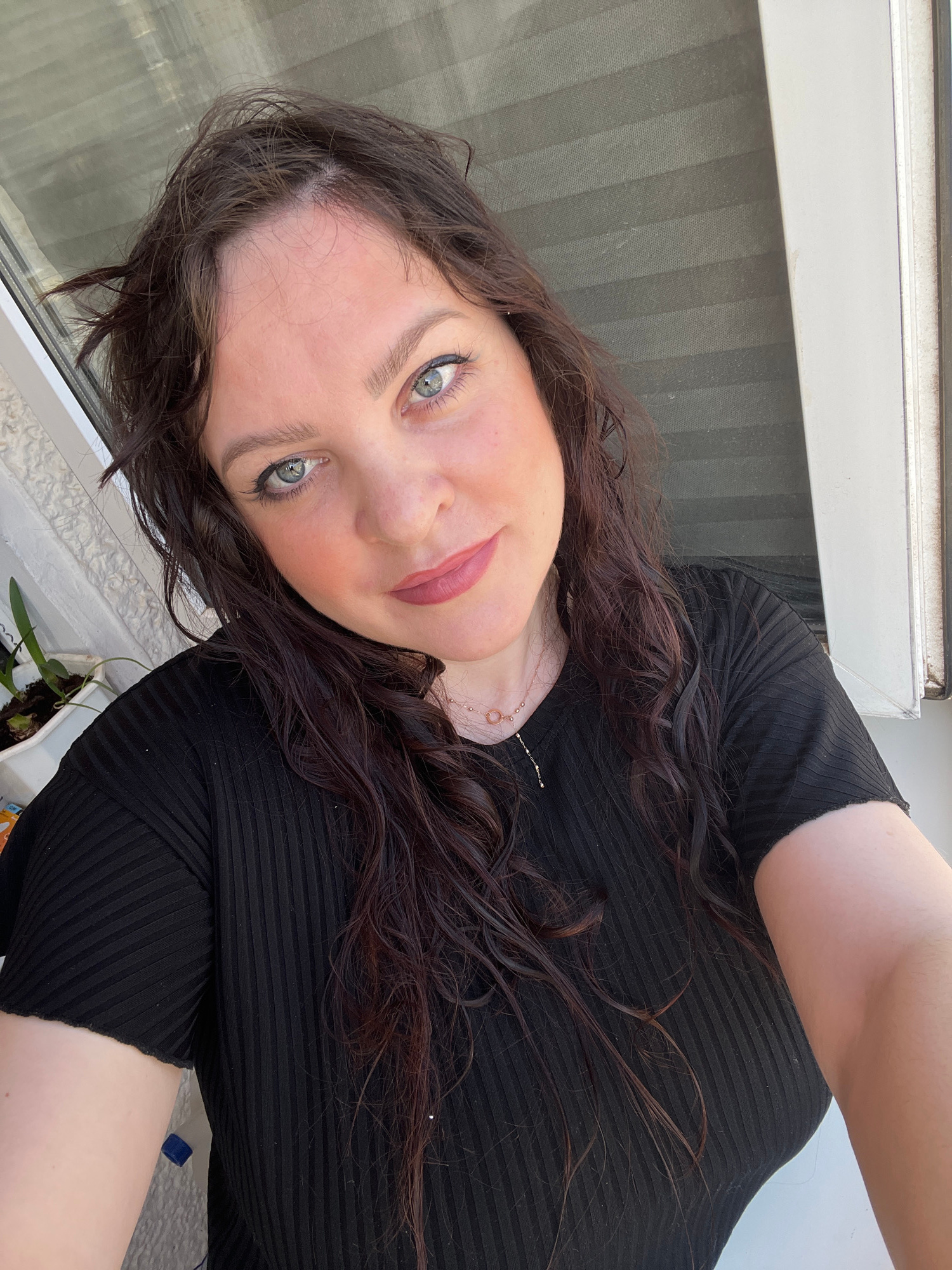 The image displays a close-up selfie of an adult female, located in the city of Noviy, Russia. The subject has dark brown, wavy hair, blue-grey eyes with dark eyeliner, defined eyebrows, and pink lips…read more