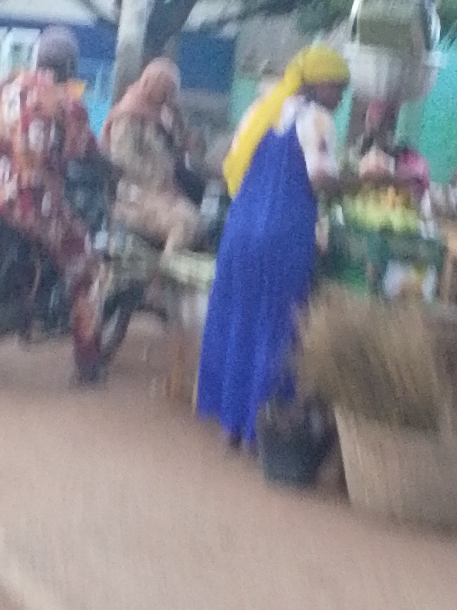 The image depicts a street scene in Tamale, Ghana. A person wearing a bright yellow headscarf and a blue dress is standing near a display of produce, likely selling items at a market. Other people are…read more