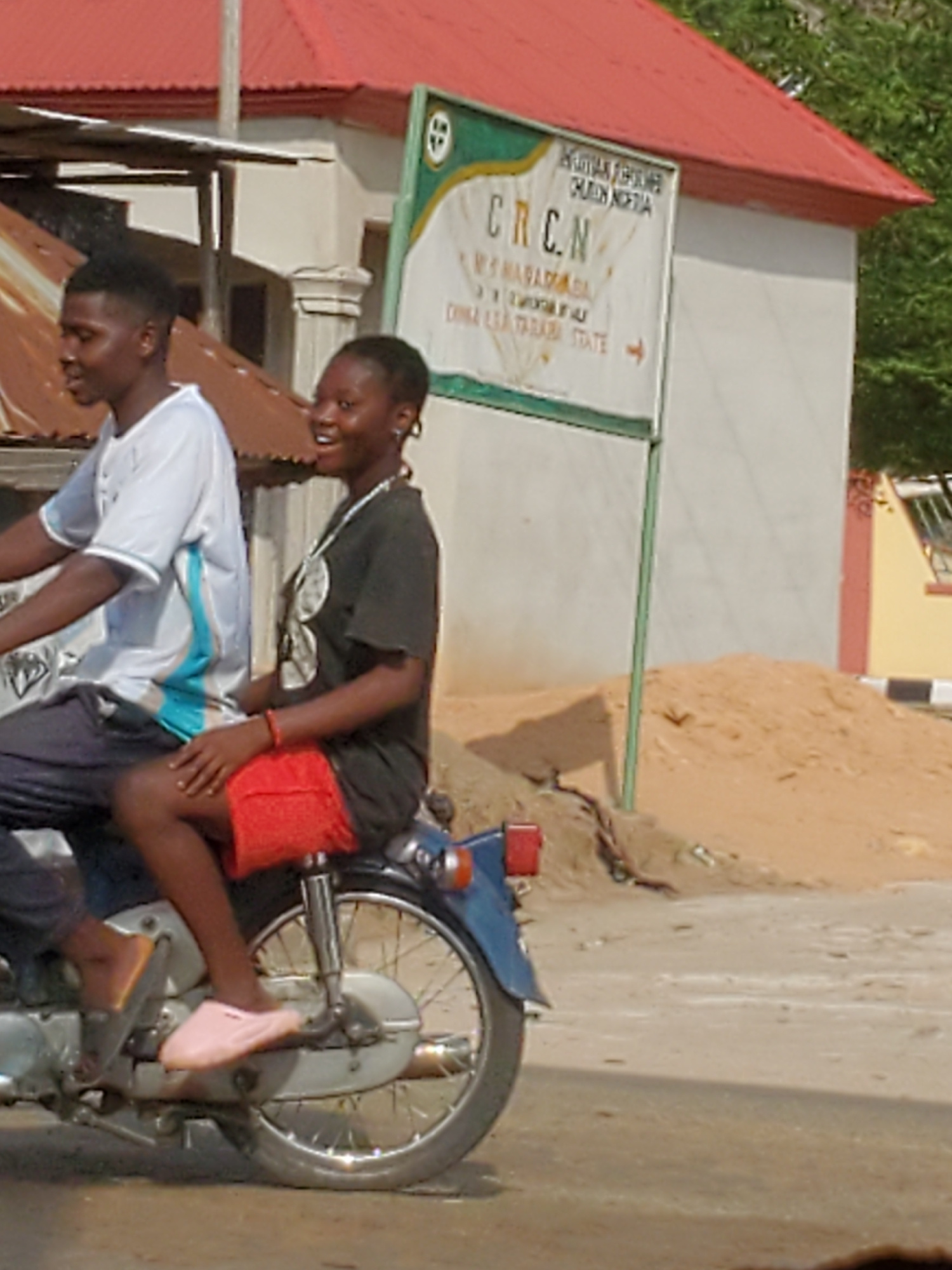 Two young individuals are interacting with a motorcycle near a building with a red roof and a sign that reads "CRCN". One person is lying on the motorcycle while the other stands beside it. The scene…read more