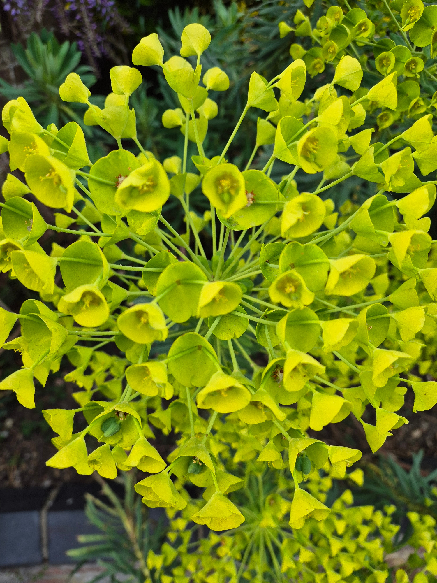 A high-angle shot reveals a cluster of bright, yellow-green flowers, likely of the Euphorbia genus. The plant is the central focus, with individual blooms exhibiting a cup-like structure, each containβ¦read more