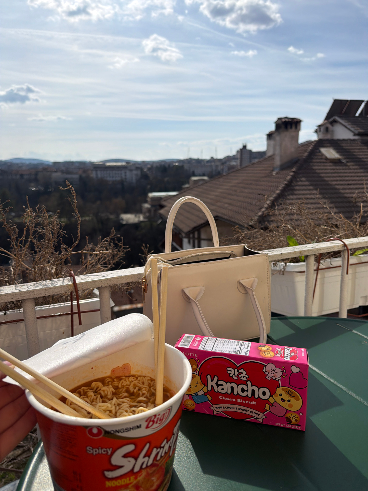 The image depicts a balcony or terrace overlooking the city of Veliko Tarnovo, Bulgaria, on a clear, sunny day with scattered clouds. In the immediate foreground, a person's hand with light skin toneβ¦read more