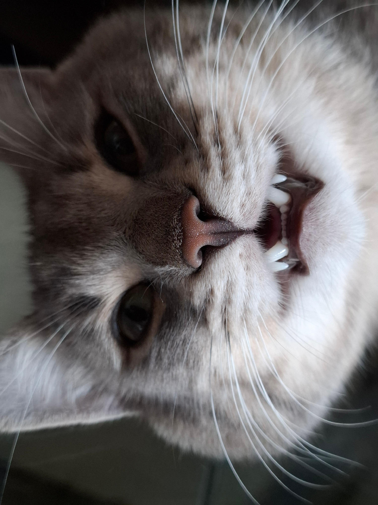 The image displays a close-up, inverted view of a domestic cat's head. The cat has grey and light brown tabby-patterned fur, with lighter fur visible around its muzzle and chin. Both dark, almond-shap…read more