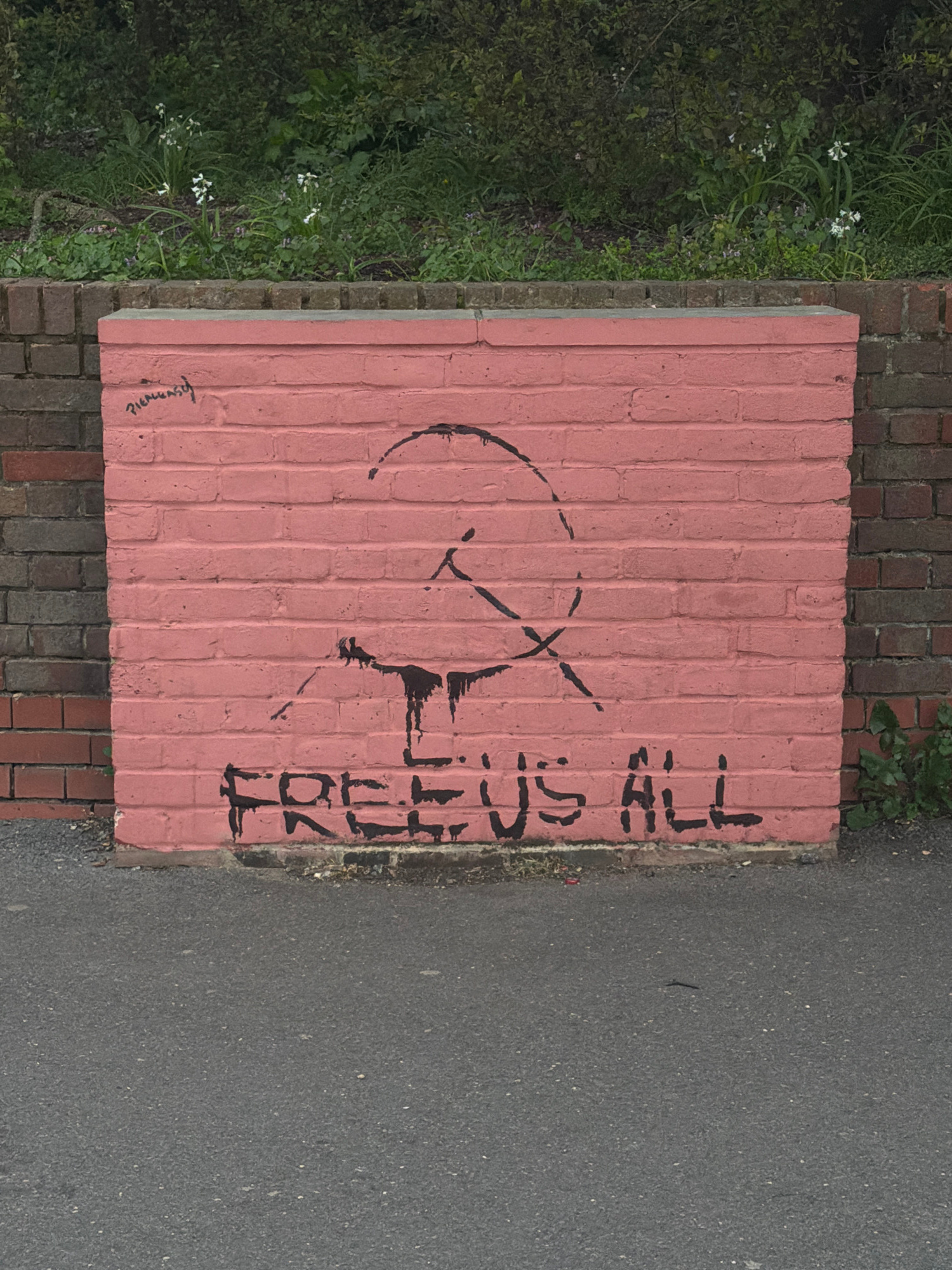 The image shows a painted brick surface with black graffiti. The graffiti includes a circular symbol bisected by a diagonal line, and the words "FREE US ALL" vertically stacked. The brick surface is p…read more
