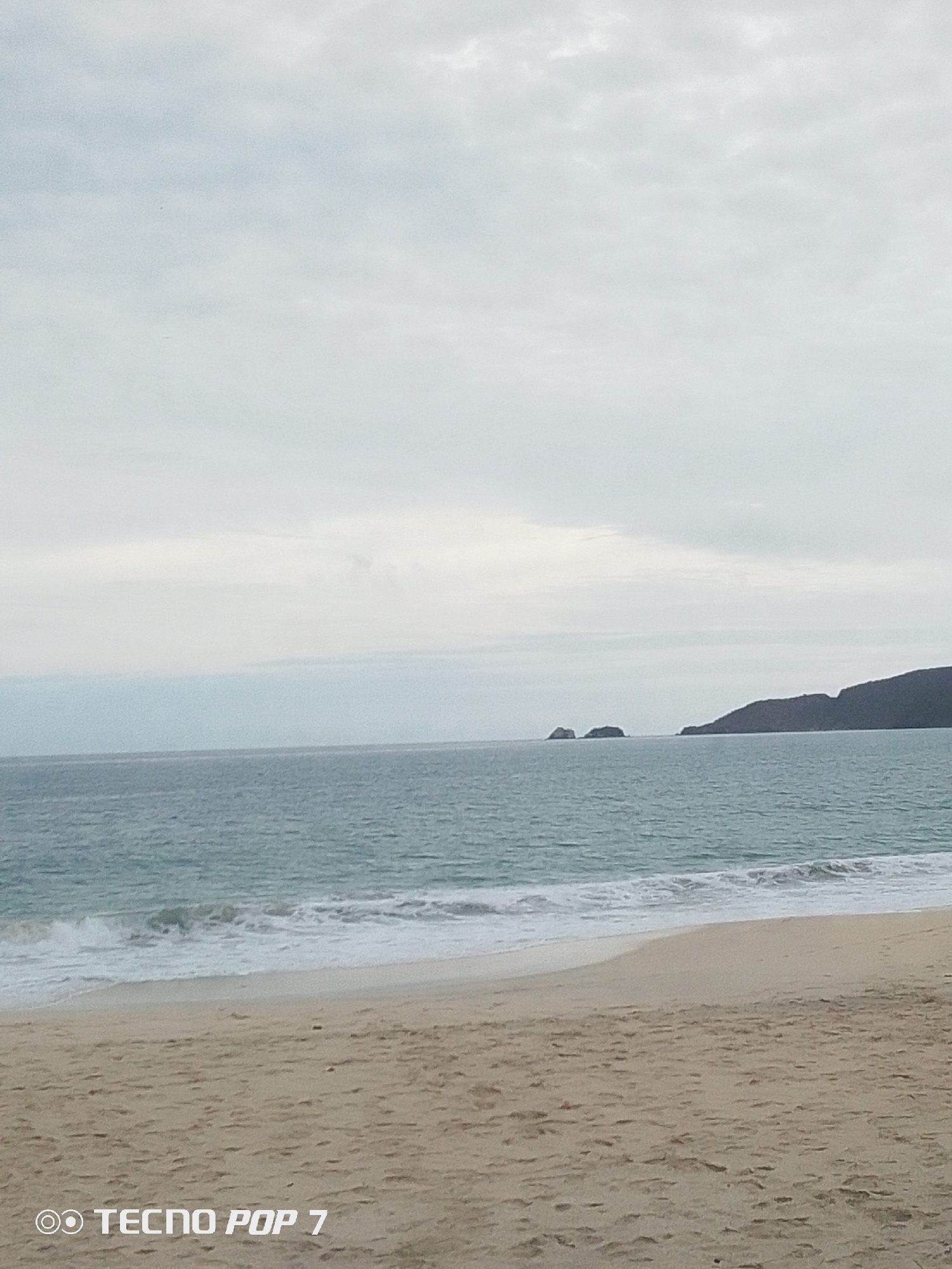 The image shows a beach in Pedro González, Venezuela on an overcast day. The scene includes a sandy beach in the foreground, light-blue ocean waves breaking on the shore, and land with rocky outcroppi…read more