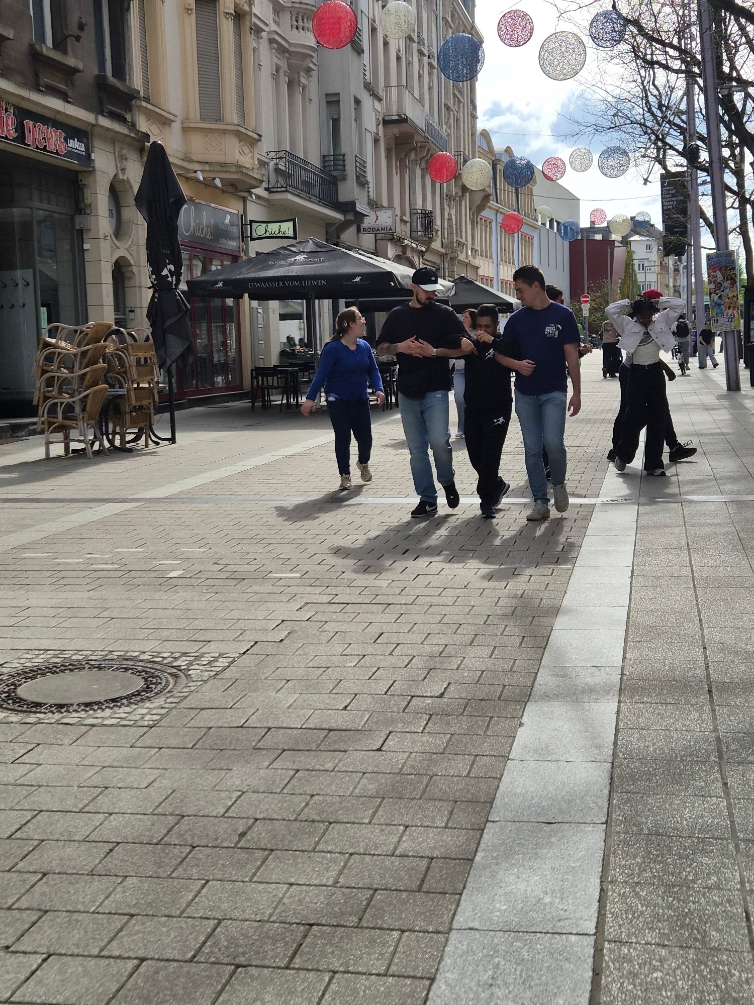 The image shows a street scene in Esch-sur-Alzette, Luxembourg. Several people are walking along the sidewalk. The street has decorative light orbs strung above. A restaurant or cafe is visible on the…read more