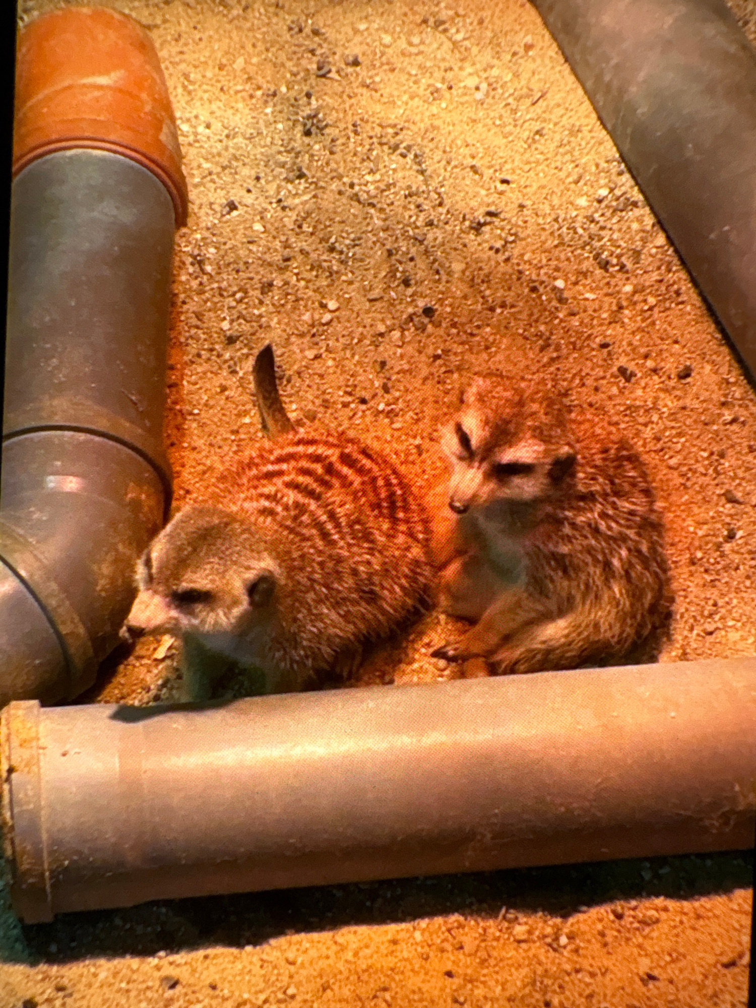 Two meerkats are visible in what appears to be a sand-filled enclosure. The enclosure also contains several sections of gray pipes. The location is likely a zoo or similar animal habitat, but there is…read more
