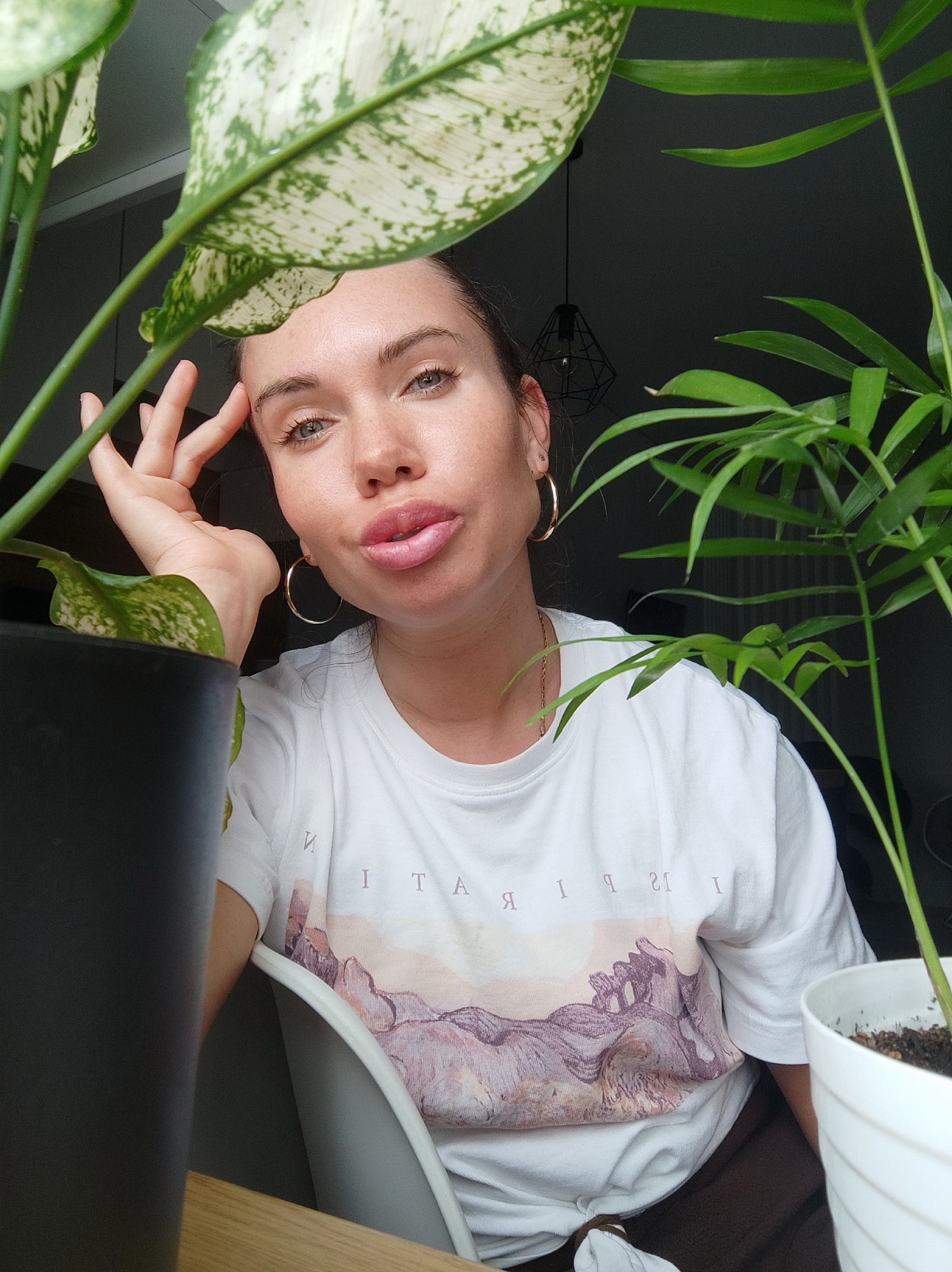 A woman is seated indoors in front of a window, surrounded by potted plants. She is wearing a white T-shirt with a graphic print, large gold hoop earrings, and a gold necklace. She has fair skin, darkβ¦read more