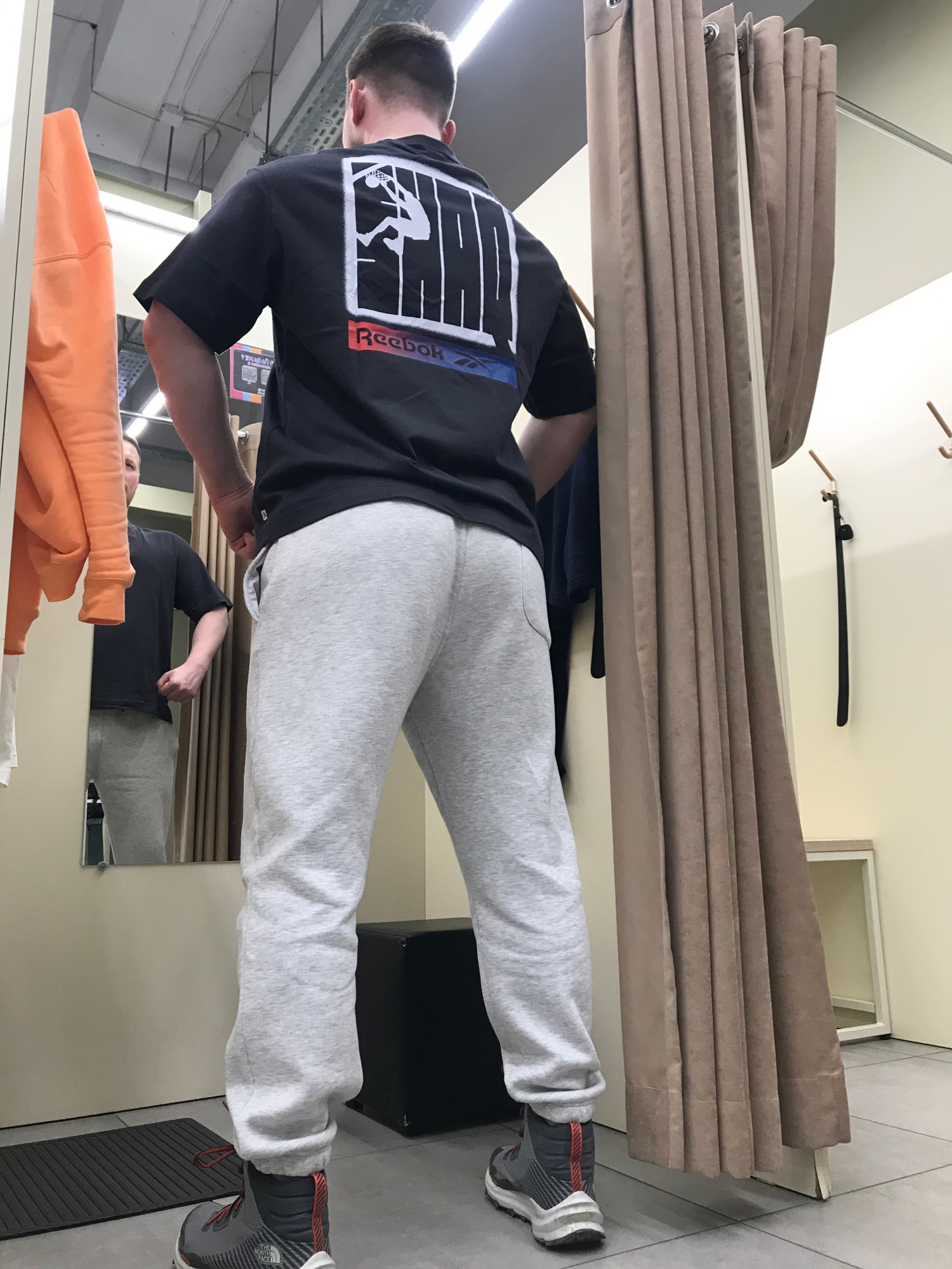 A man stands inside a dressing room. He wears gray sweatpants, a black t-shirt with a "Reebok" logo, and gray sneakers. The dressing room has beige curtains. Other clothing items are visible, includin…read more