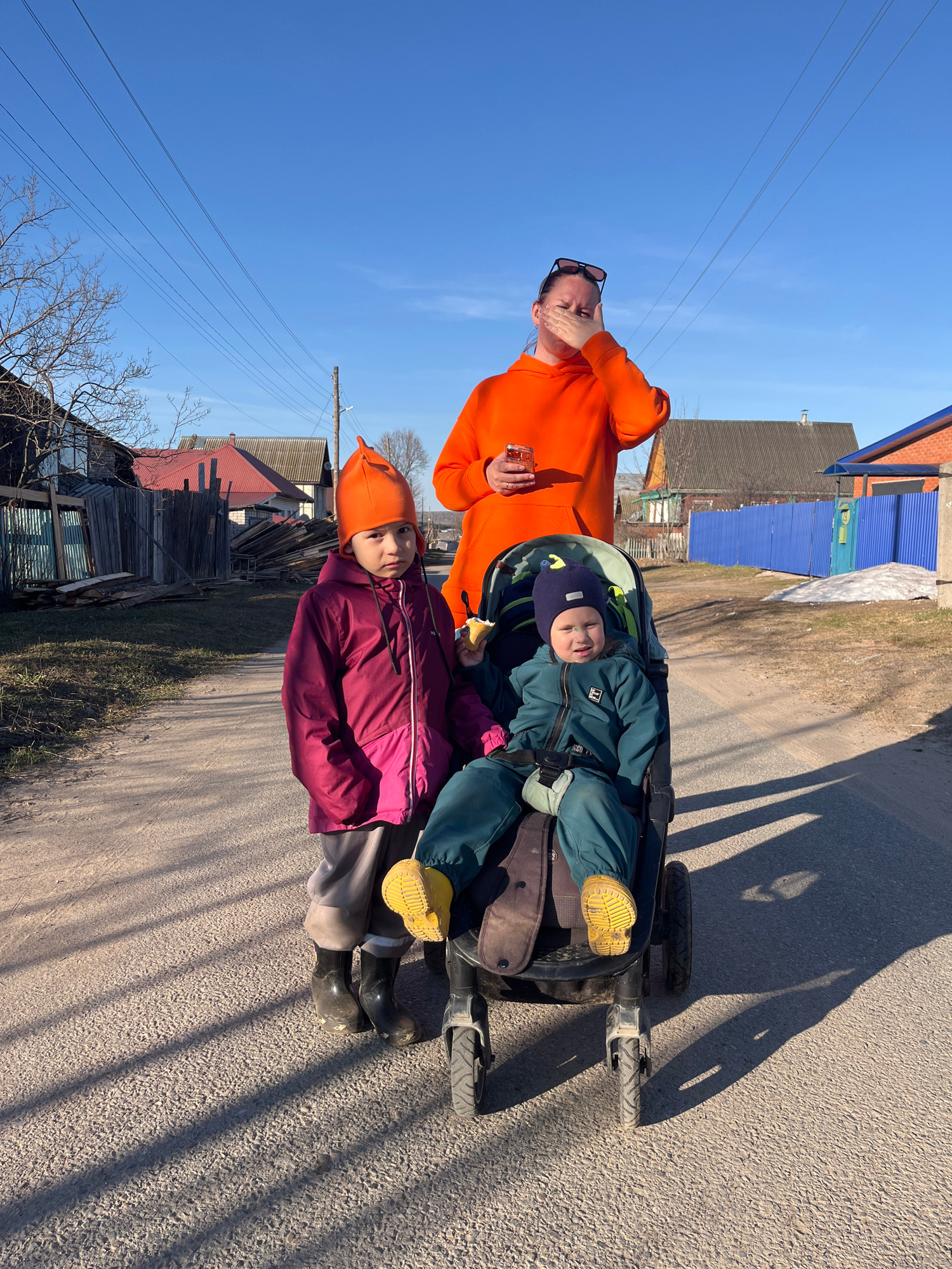 The image portrays an adult and two children enjoying a sunny day outdoors in what appears to be a rural or semi-urban area of Chaikovsky, Russia. The sky is a clear, bright blue, with power lines str…read more