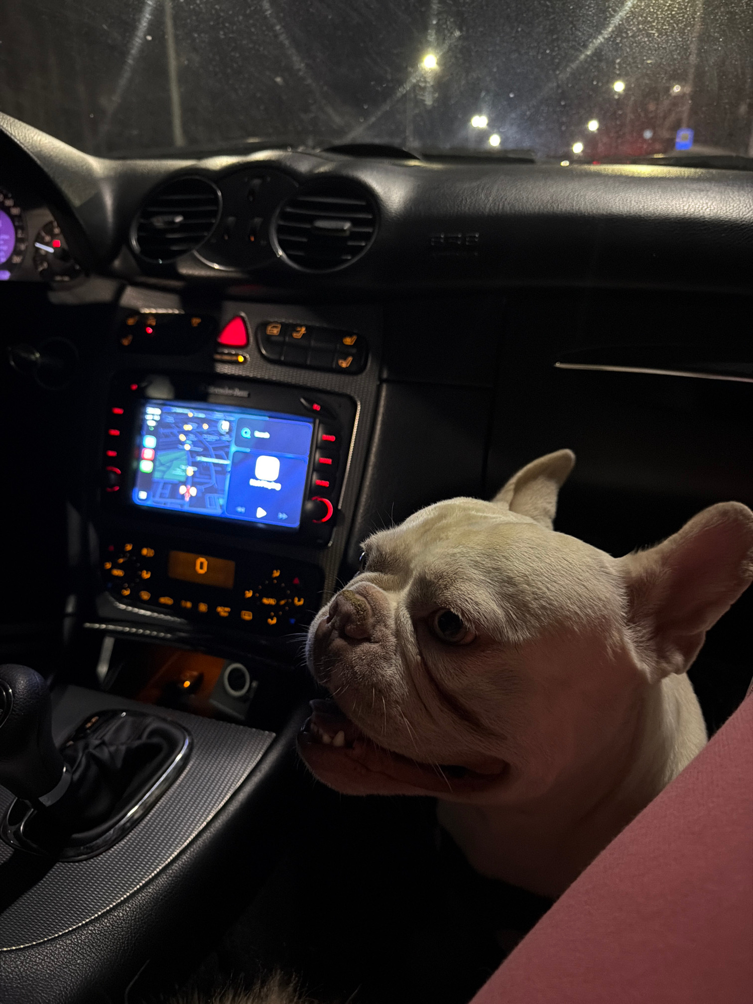 A French Bulldog leans over the center console of a car, with its head and upper body extending into the car's interior. The center console features air vents, various buttons, and a digital display s…read more