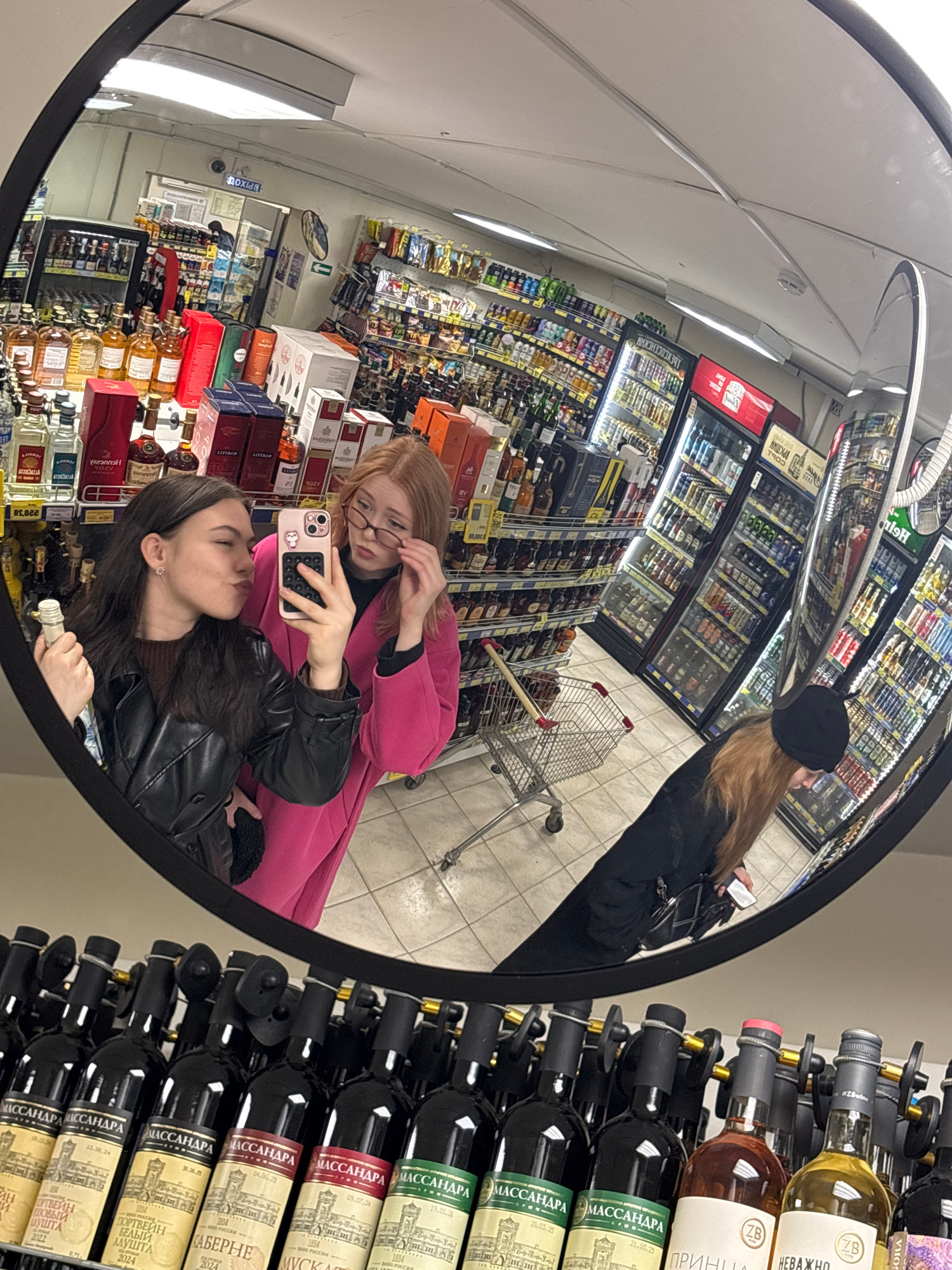 A wide-angle, circular reflection in a convex security mirror captures a scene inside a supermarket or liquor store in Perm, Russia. Two young women are the main subjects, seemingly taking a selfie. T…read more