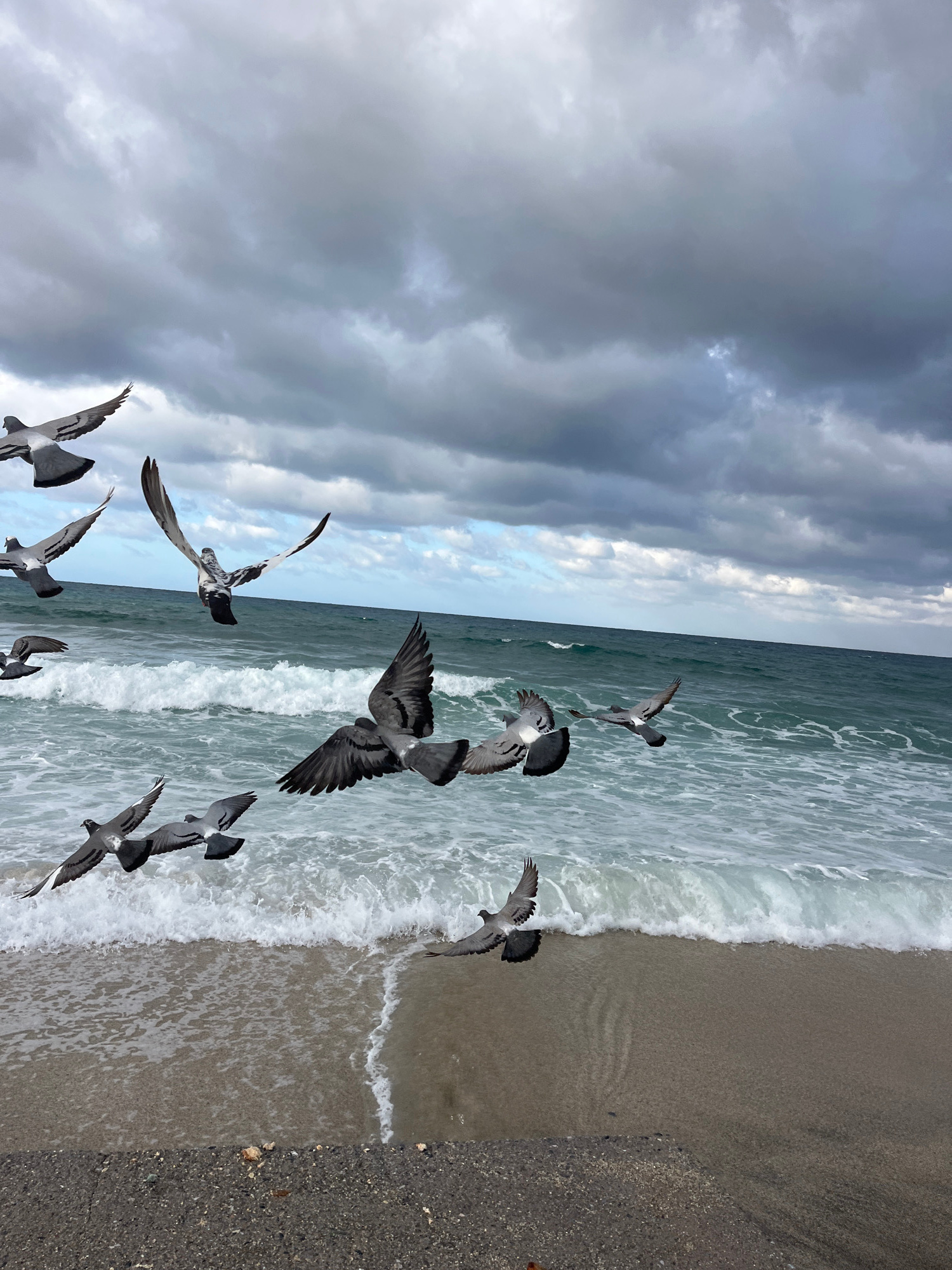 The image depicts a beach scene in Alanya, Turkey. The foreground features a flock of pigeons in flight, wings outstretched. The background showcases the sea meeting the shore. White foamy waves crash…read more