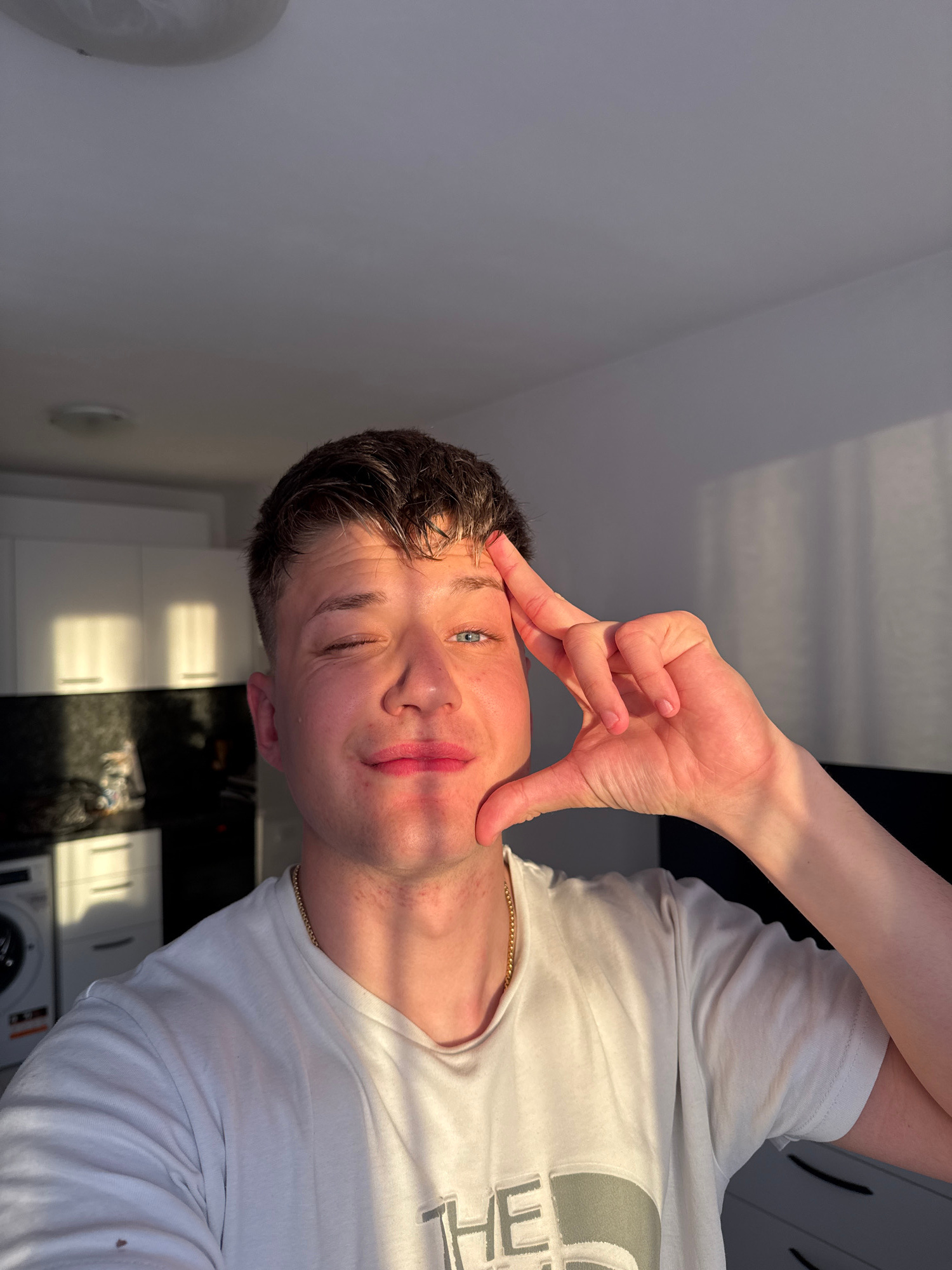 A young man with dark hair and blue eyes is posing indoors. He is wearing a white t-shirt and a gold chain. He is holding his hand up to his forehead, with his fingers making a triangle shape. The bac…read more