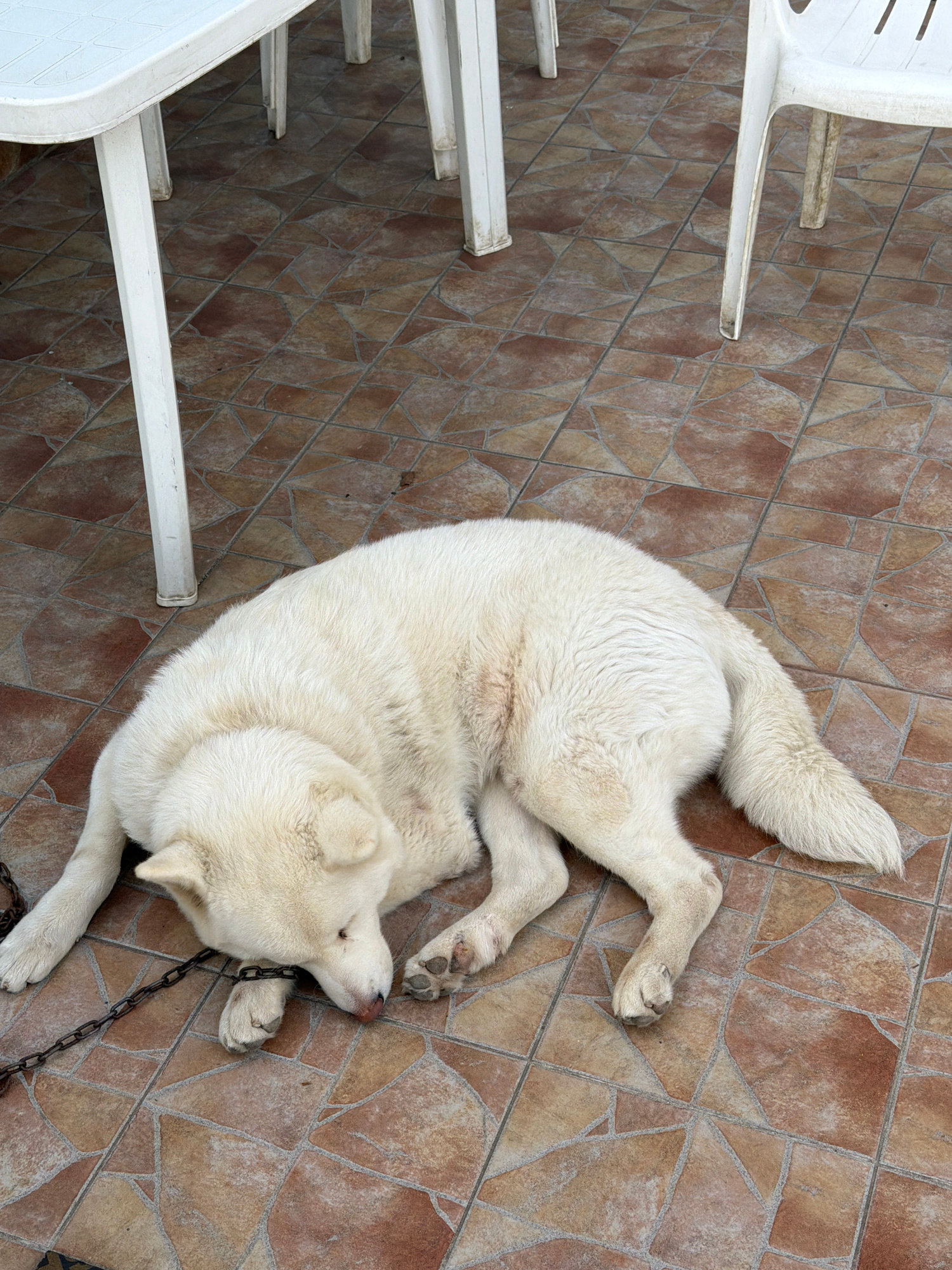 A large, white-furred dog is depicted resting on a tiled outdoor floor in Tsarevo, Bulgaria. The dog, possibly a husky or Akita type, lies comfortably on its left side, appearing to be asleep or deepl…read more