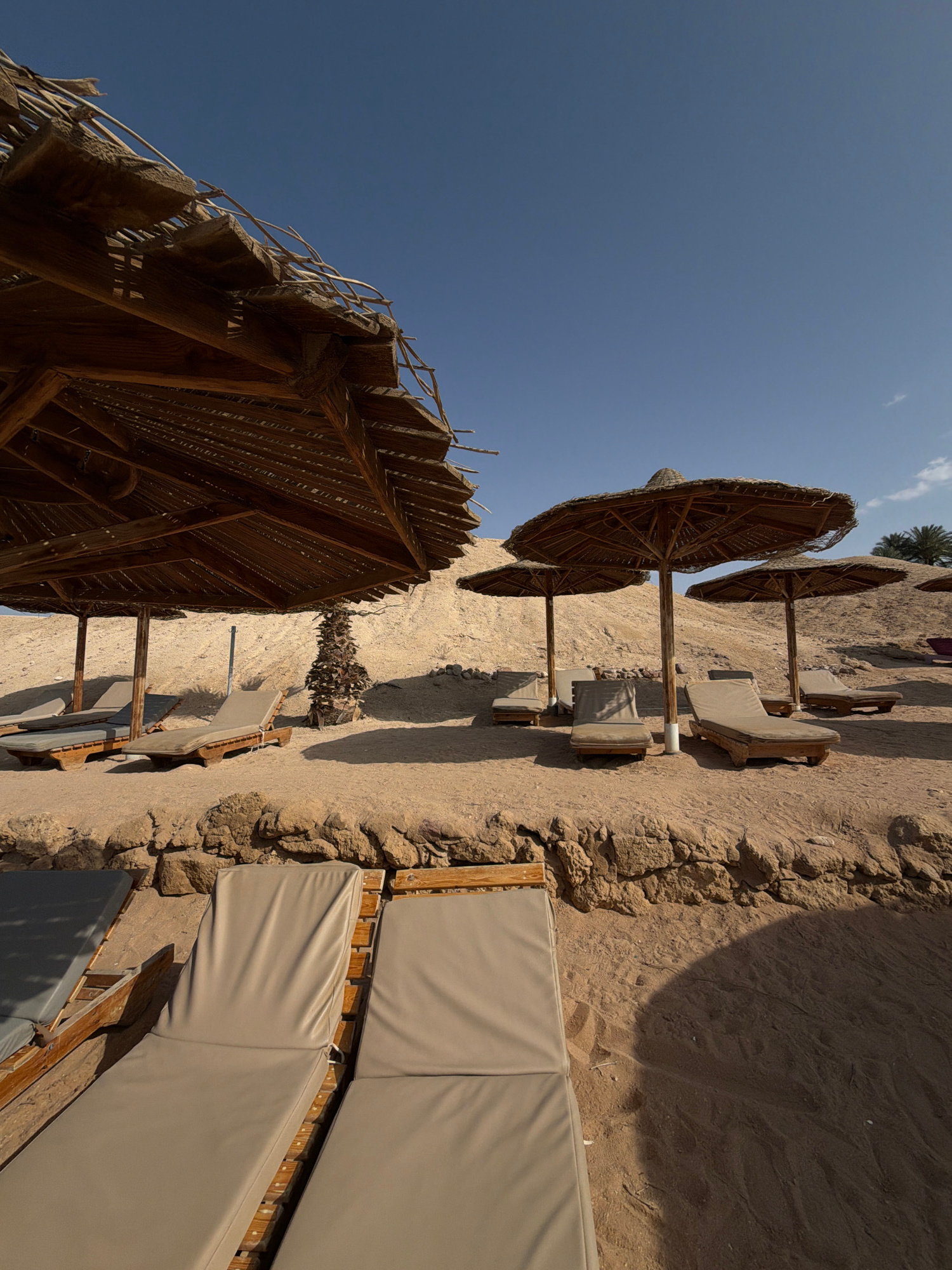 The image depicts an outdoor scene likely at a resort or beach in Sharm El Sheikh, Egypt. The view is from a low angle, showcasing sun umbrellas made of dried reeds. Lounge chairs are placed beneath t…read more