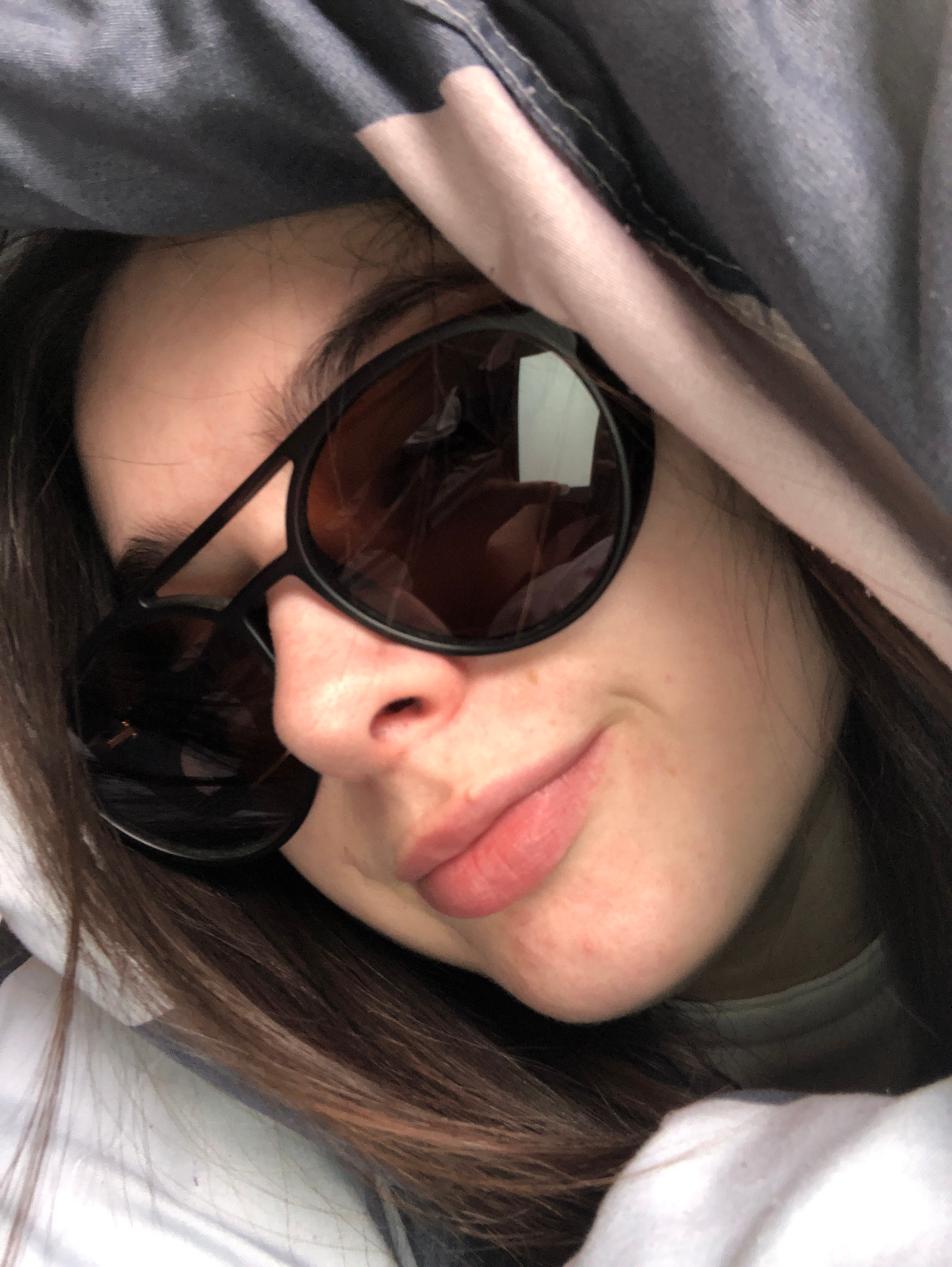 A close-up, slightly angled photograph depicts a person with dark hair partially covered by a grey patterned duvet and a white pillow. The individual is wearing round-framed sunglasses. The background…read more