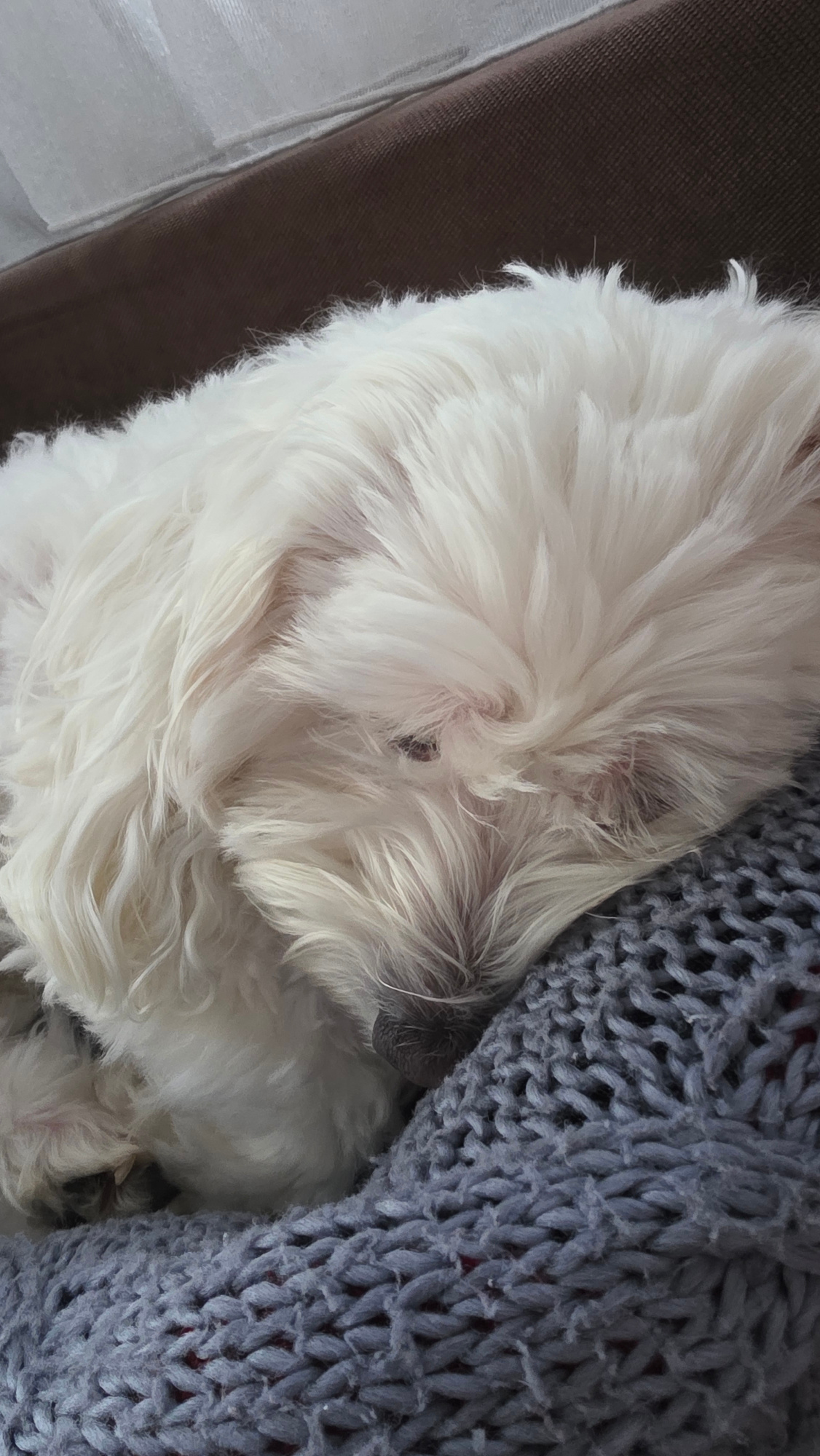 A white, small, fluffy dog is curled up and sleeping on a brown couch next to a chunky knit gray blanket. The dog's nose is near the blanket. The photograph appears to be taken indoors. I am unable to…read more