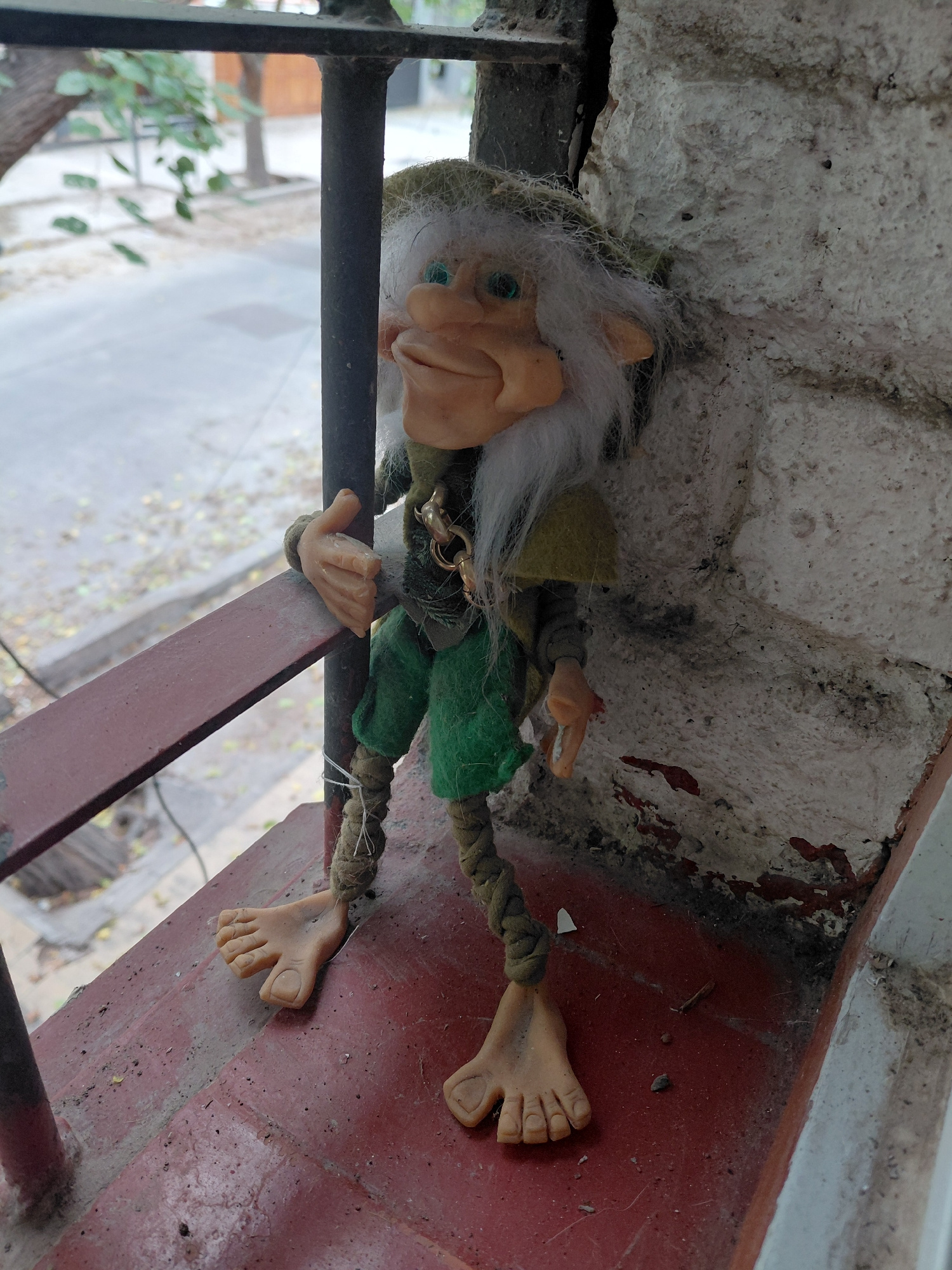 A doll resembling a goblin or gnome hangs upside down on a metal structure, possibly a fire escape. The doll has a large nose, pointed ears, white hair, and is dressed in green clothing. Its limbs areβ¦read more