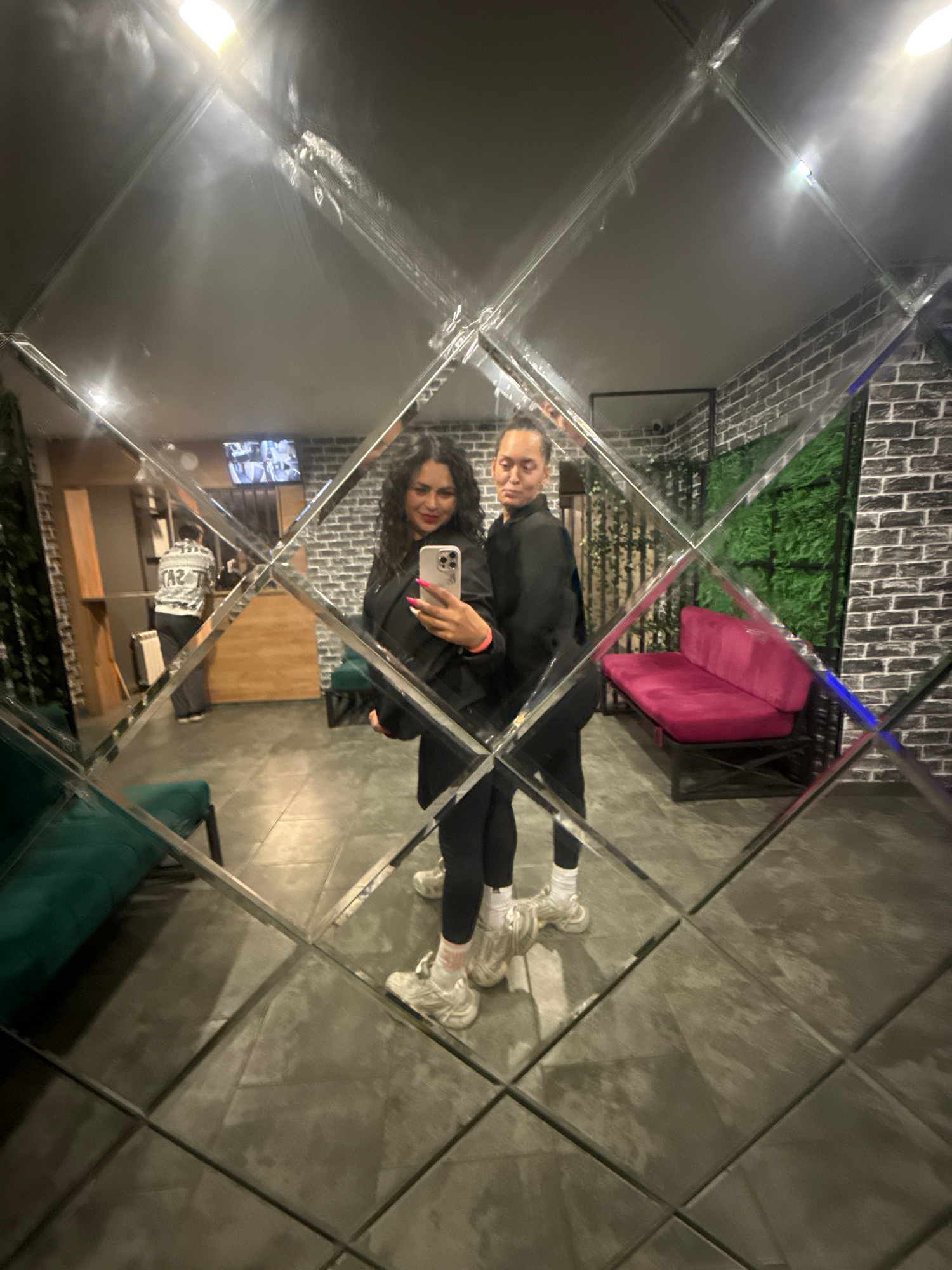 Two women are seen in a mirrored wall within an interior space. One woman holds a smartphone, suggesting she is taking a photo. Both are wearing dark clothing and athletic shoes. The background reveal…read more