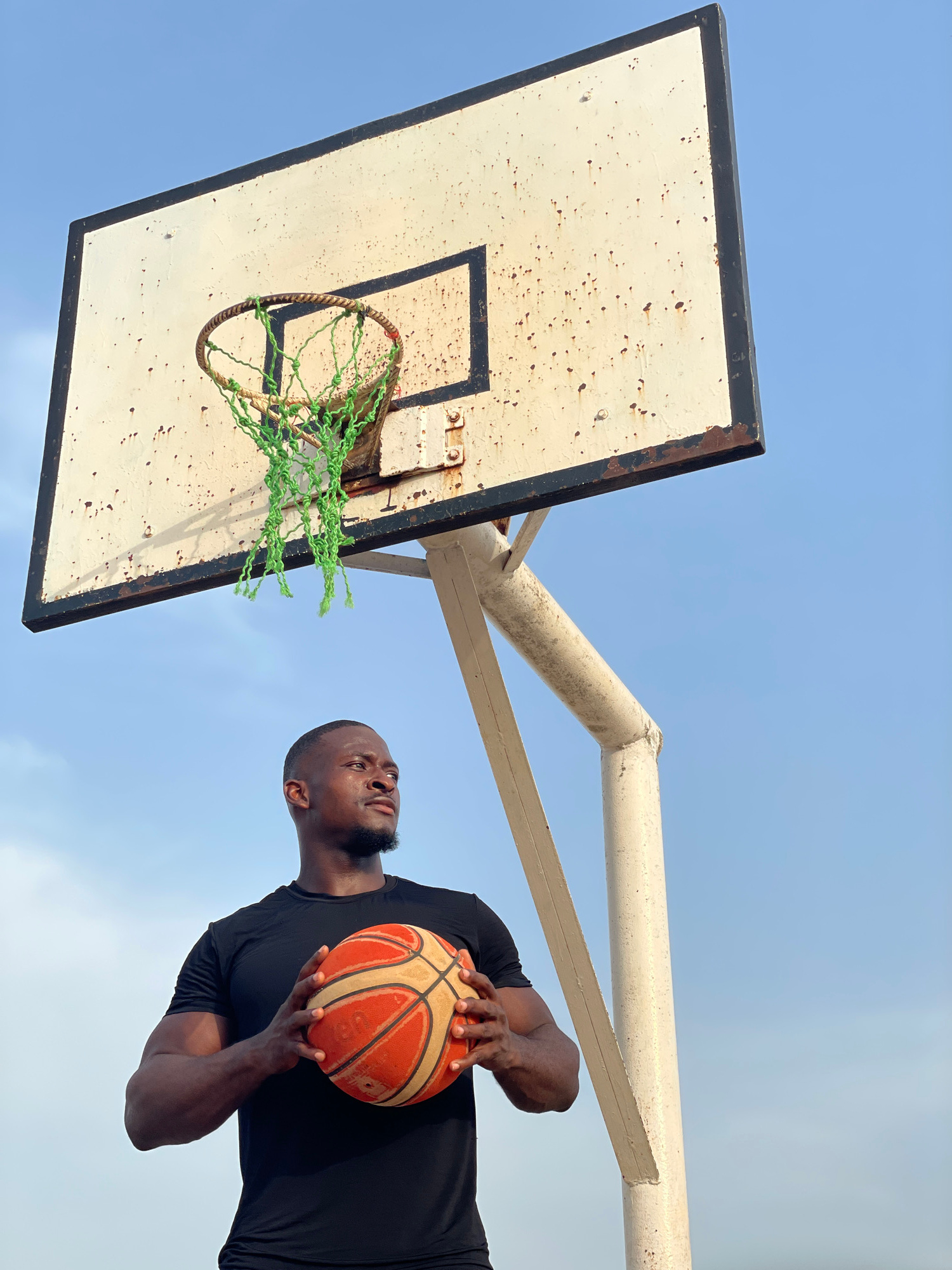 The image depicts a man holding a basketball, standing in front of a weathered basketball hoop in Akwanga, Nigeria. The hoop has a white backboard with a black border and a rusty metal ring with a gre…read more