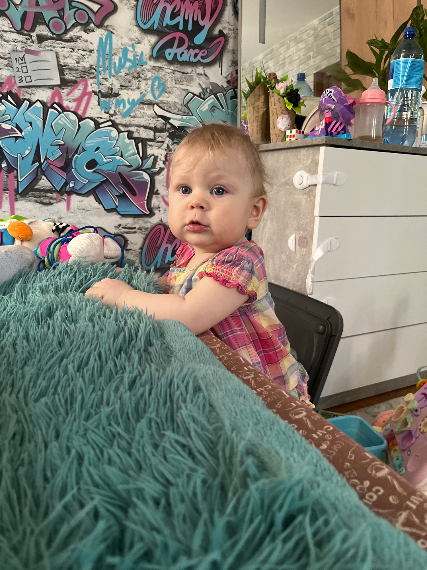 A close-up shot displays a young child with fair skin and light hair, lying on a fluffy, light-blue material with a graffiti-style design wall in the background. The child is partially dressed in a pl…read more