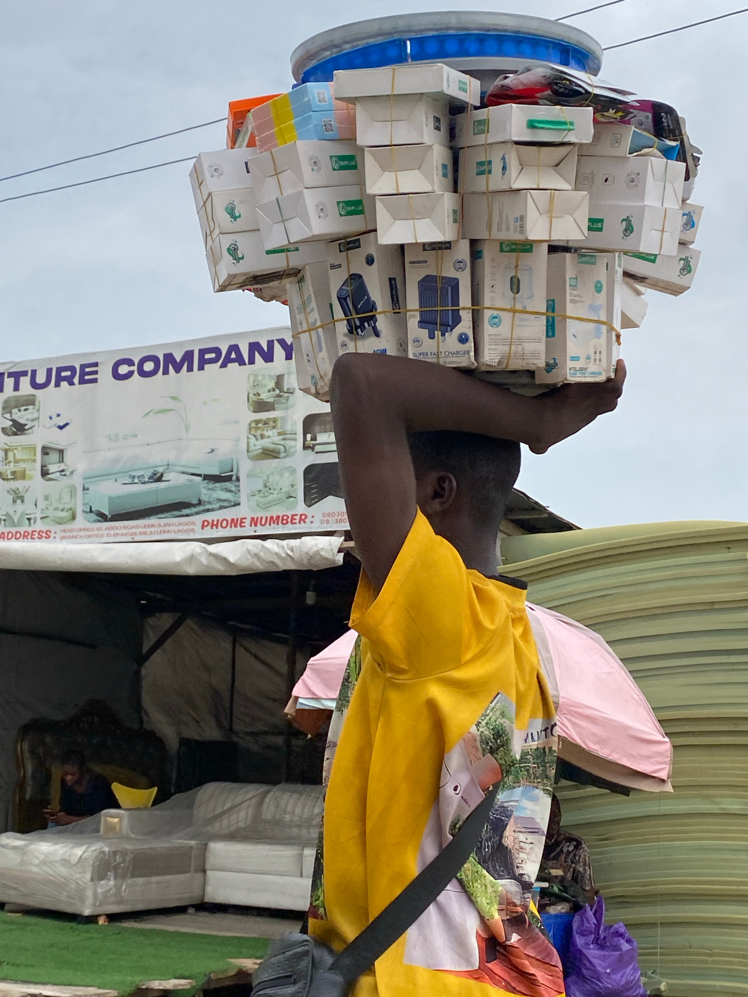 An outdoor scene in Ado, Nigeria, depicts a man balancing a large stack of small white boxes on his head. The boxes are secured with rubber bands and appear to contain phone charger adapters, labeled…read more