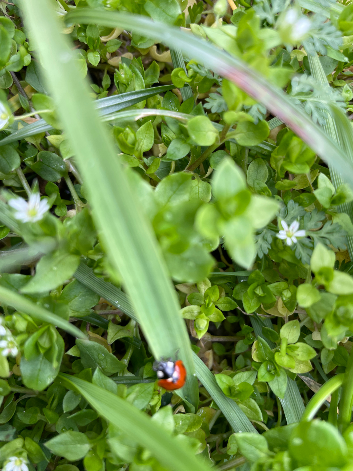 The image is a close-up shot of vegetation, including grass, small green plants with round leaves, and tiny white flowers. A red ladybug with black spots is positioned on a blade of grass. The scene a…read more