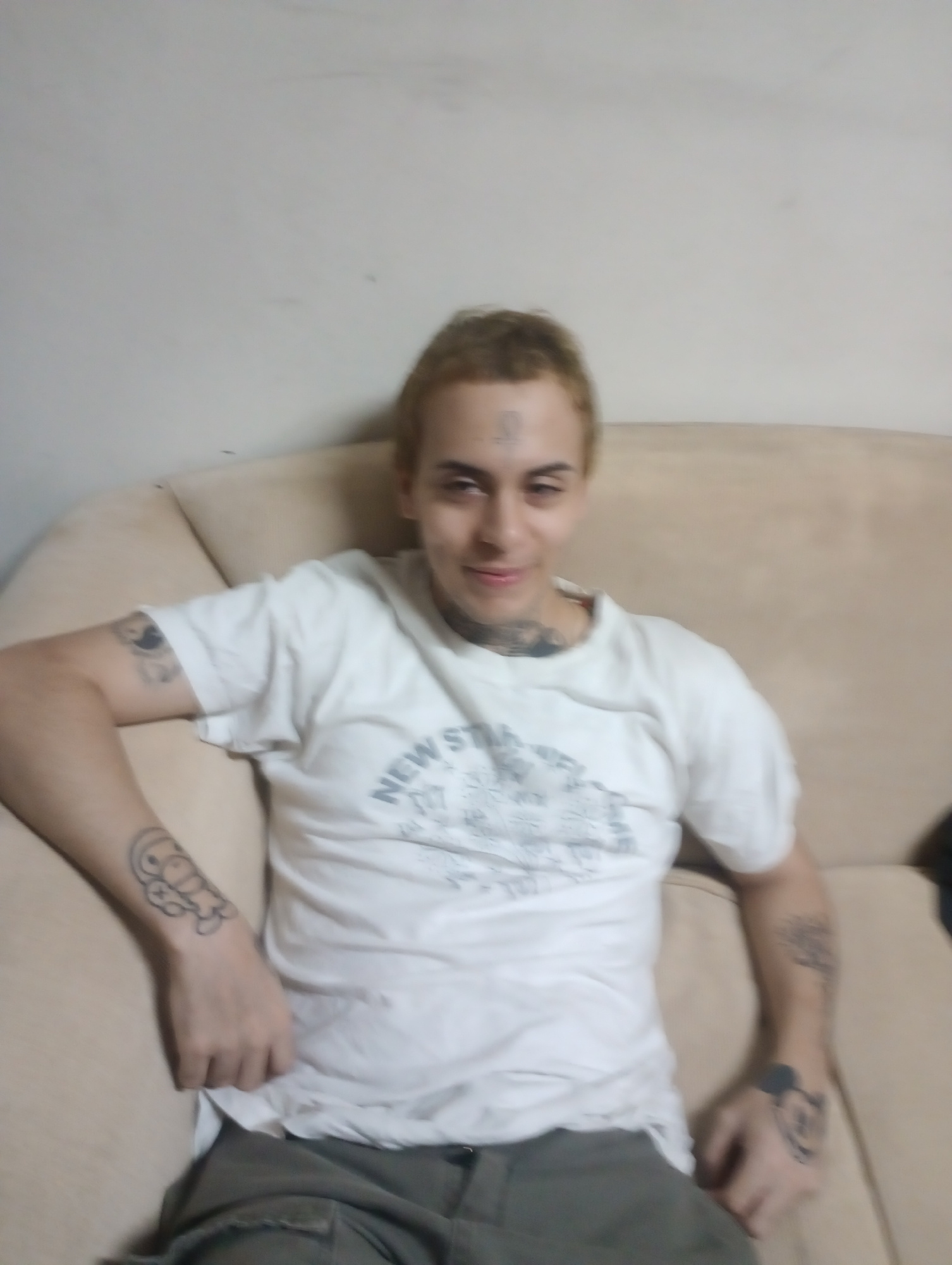 A person is lying on a beige couch. The person has light brown hair and several visible tattoos on their face, neck, and arms. They are wearing a white t-shirt with writing on it and green pants. The…read more