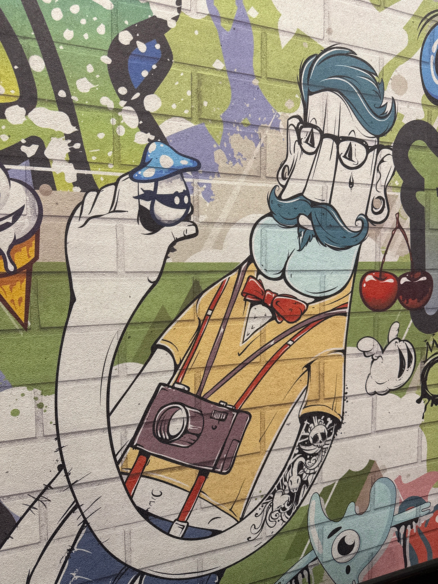 This media file captures a vibrant and detailed piece of urban art, likely a mural or graffiti, displayed on a textured surface resembling a block or brick wall. The artwork features a stylized, carto…read more