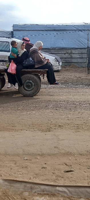 The image displays four individuals on barren, uneven ground in Khan Yunis, Palestinian Territory. On the left, a woman wearing a black abaya and a light-colored hijab is seated on a two-wheeled woodeβ¦read more